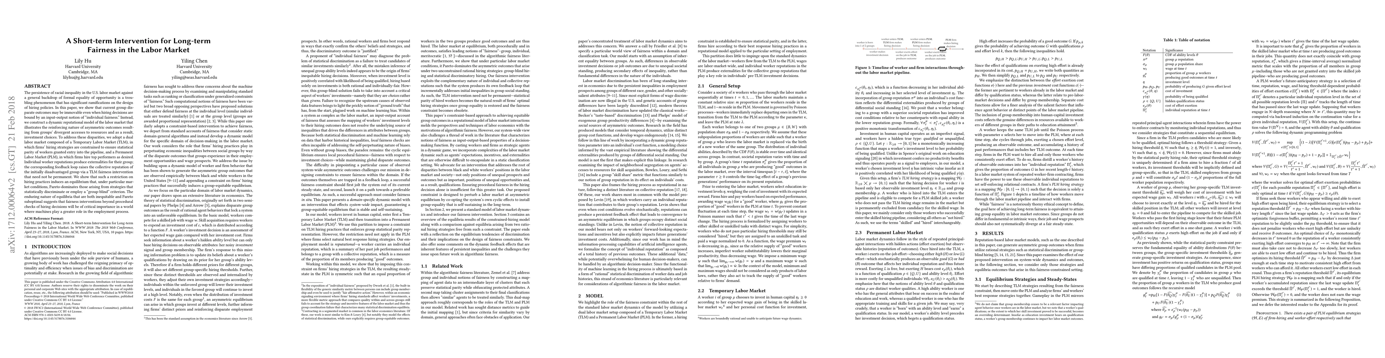 This paper explores racial inequality in the U.S. labor market, proposing a Temporary Labor Market (TLM) to address disparities by ensuring statistical parity in hiring, while maintaining a Permanent Labor Market (PLM) for top performers. The intervention aims to elevate the collective reputation of disadvantaged groups, suggesting that long-term fairness requires more than procedural fairness in hiring.
