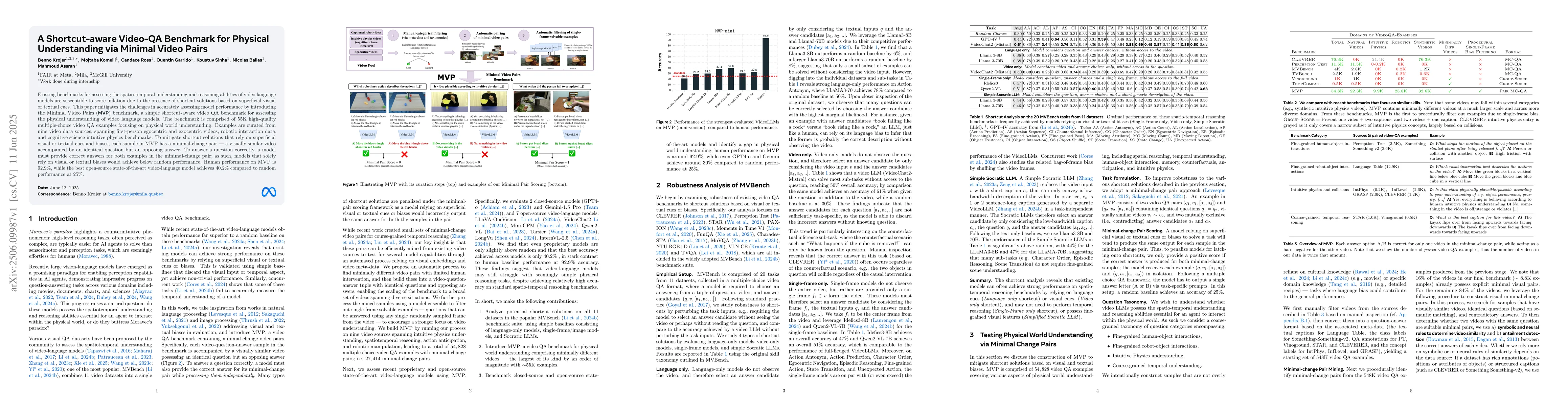 A new benchmark, Minimal Video Pairs (MVP), is introduced to assess video language models' physical understanding, outperforming existing benchmarks with 92.9% human accuracy.