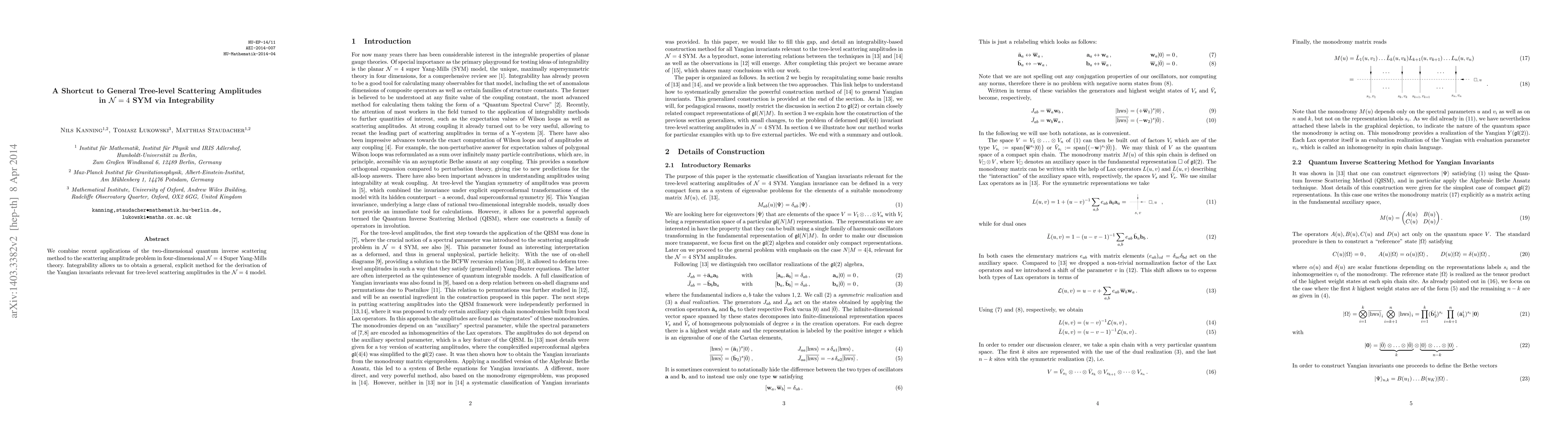 We combine recent applications of the two-dimensional quantum inverse scattering method to the scattering amplitude problem in four-dimensional N=4 Super Yang-Mills theory. Integrability allows us to obtain a general, explicit method for the derivation of the Yangian invariants relevant for tree-level scattering amplitudes in the N=4 model.