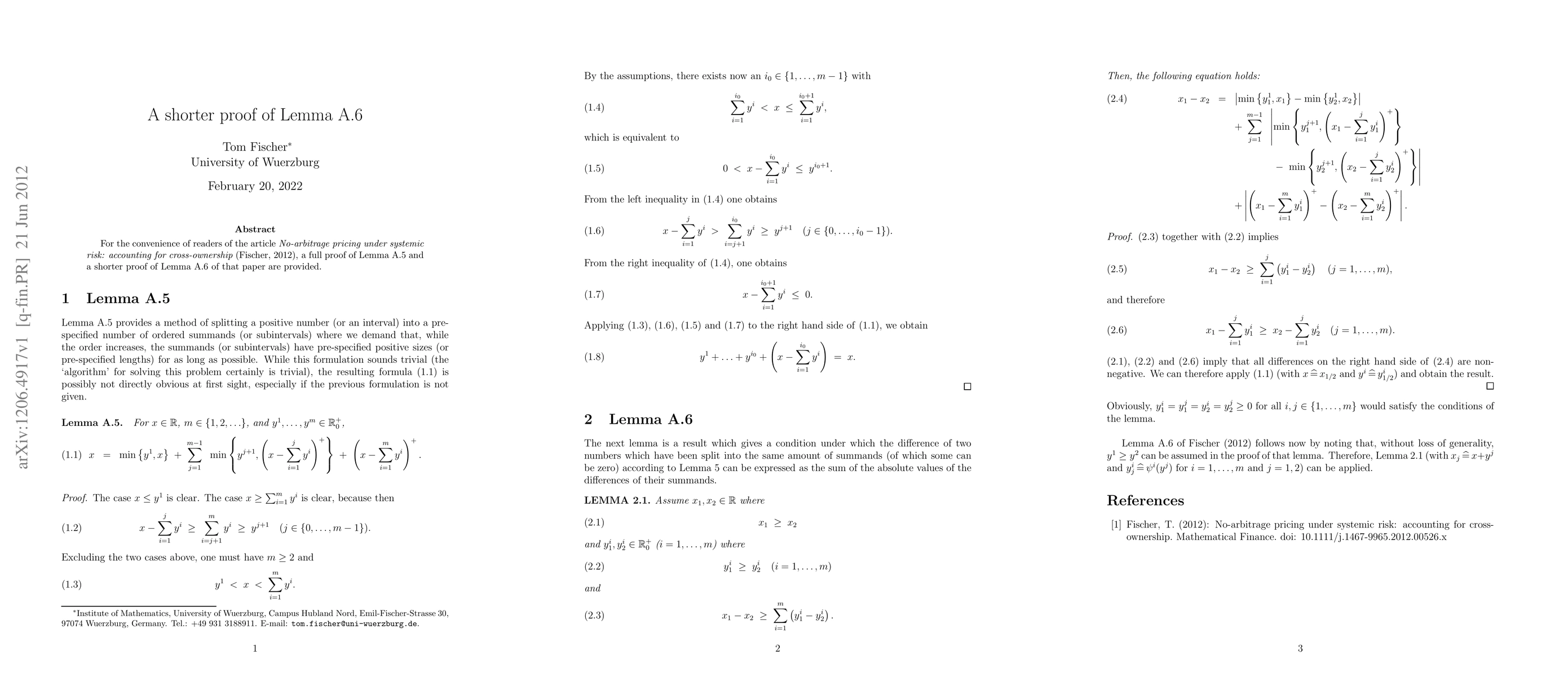 This paper provides a concise proof for Lemma A.6 from Fischer's 2012 work on no-arbitrage pricing under systemic risk, aiming to enhance the accessibility of the original article's mathematical details. The focus is on simplifying the proof to aid readers in understanding the underlying financial theory.