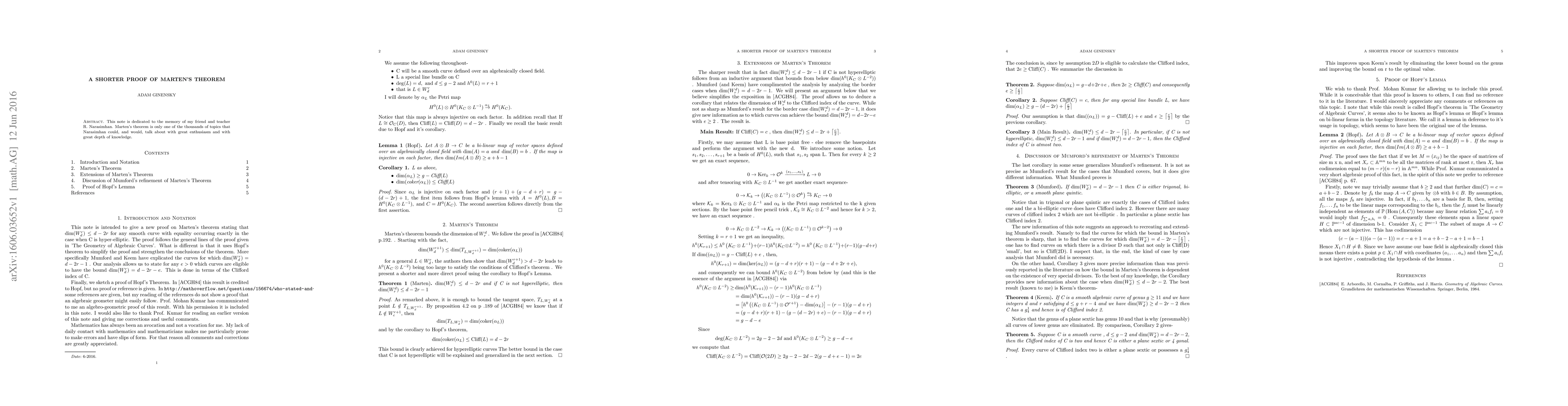 This paper presents a streamlined proof of Marten's theorem using Hopf's theorem to show that the dimension of the space of differential forms on a smooth curve is at most $d-2r$, with equality only for hyper-elliptic curves. The approach simplifies and strengthens the original proof.