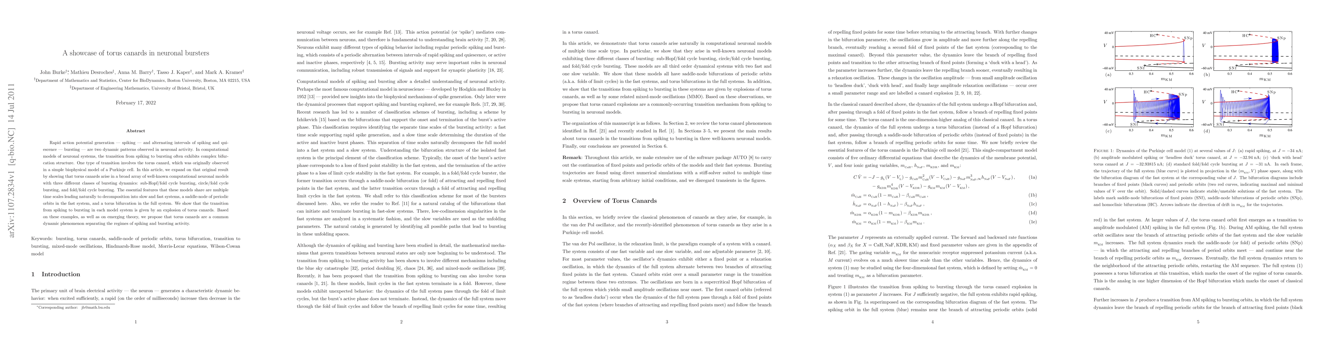 This research paper explores the presence of torus canards in various computational neuronal models, demonstrating that these phenomena frequently mark the transition from spiking to bursting activity. The study identifies three classes of bursting dynamics where torus canards occur, highlighting shared features such as multiple time scales and bifurcation structures.