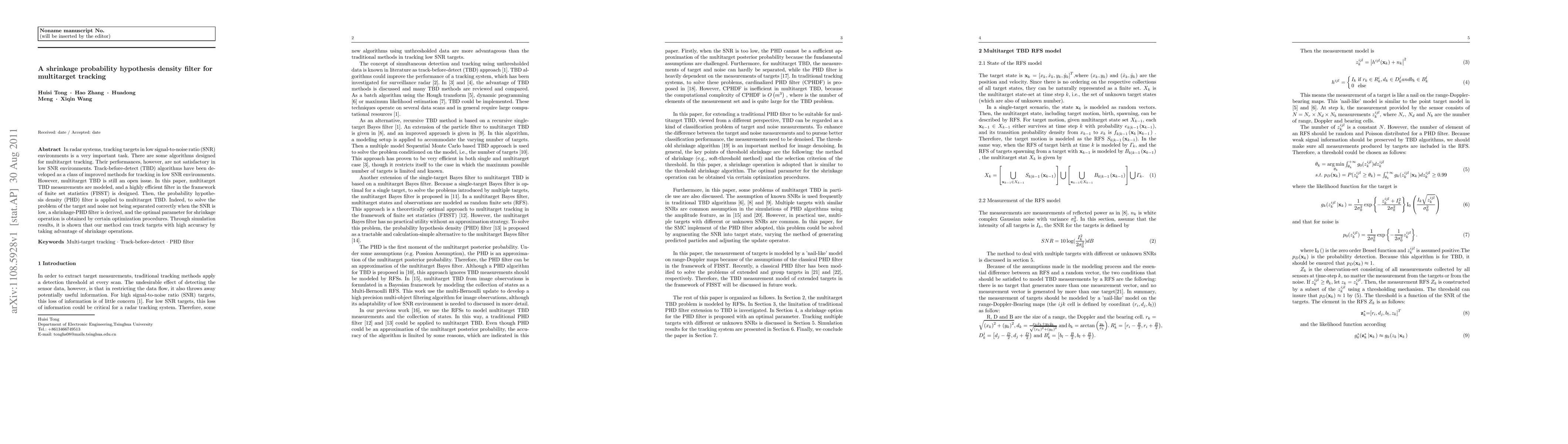 This paper proposes a shrinkage probability hypothesis density (PHD) filter for multitarget tracking in low signal-to-noise ratio (SNR) environments. The method leverages finite set statistics (FISST) and track-before-detect (TBD) techniques to achieve high accuracy in tracking, with optimal shrinkage parameters determined through optimization procedures, demonstrating superior performance via simulation.