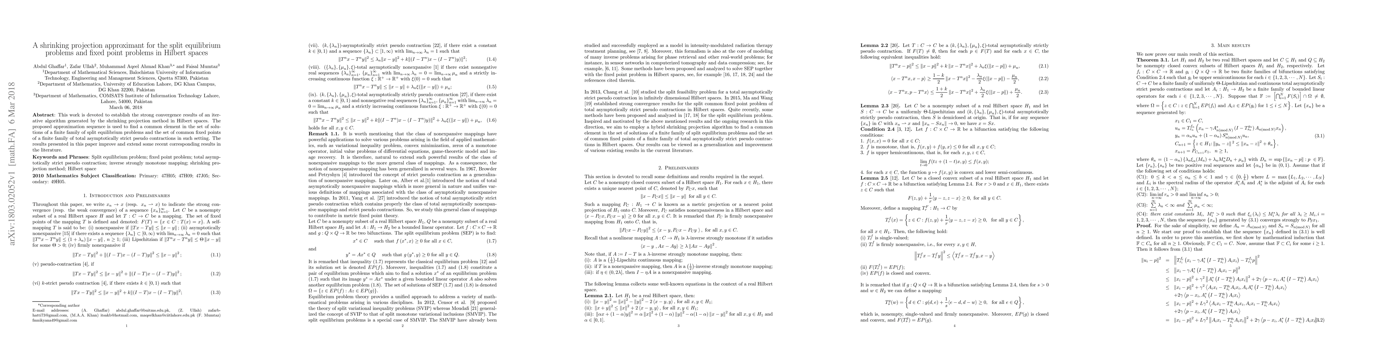 This work is devoted to establish the strong convergence results of an iterative algorithm generated by the shrinking projection method in Hilbert spaces. The proposed approximation sequence is used to find a common element in the set of solutions of a finite family of split equilibrium problems and the set of common fixed points of a finite family of total asymptotically strict pseudo contractions in such setting. The results presented in this paper improve and extend some recent corresponding results in the literature.