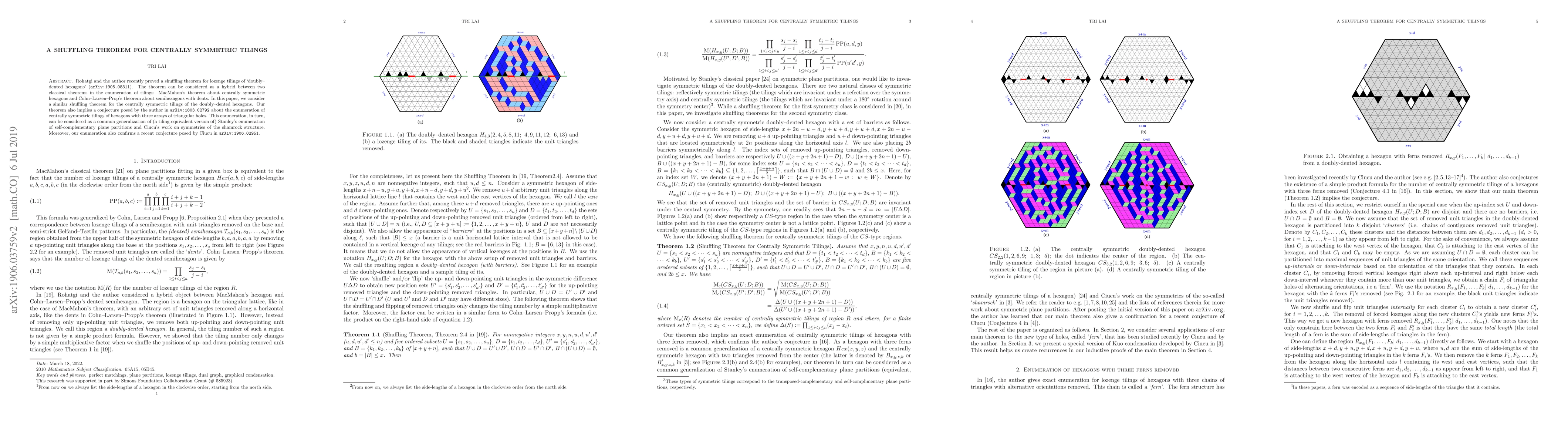 This paper proves a shuffling theorem for centrally symmetric tilings of doubly-dented hexagons, bridging MacMahon's and Cohn-Larsen-Prop's classical tiling enumeration theorems. It also verifies a conjecture on the enumeration of hexagons with triangular holes, generalizing Stanley's and Ciucu's works.