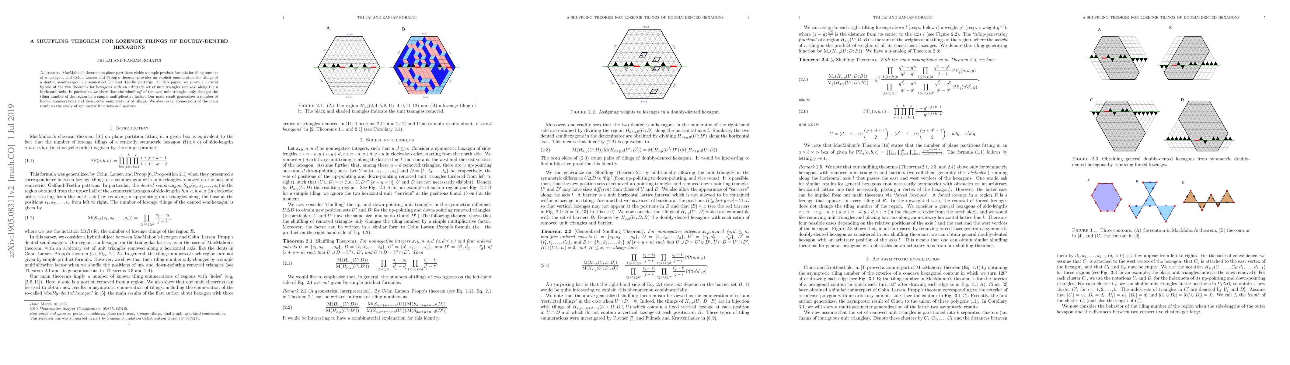 MacMahon's theorem on plane partitions yields a simple product formula for tiling number of a hexagon, and Cohn, Larsen and Propp's theorem provides an explicit enumeration for tilings of a dented semihexagon via semi-strict Gelfand--Tsetlin patterns. In this paper, we prove a natural hybrid of the two theorems for hexagons with an arbitrary set of unit triangles removed along a horizontal axis. In particular, we show that the `shuffling' of removed unit triangles only changes the tiling number of the region by a simple multiplicative factor. Our main result generalizes a number of known enumerations and asymptotic enumerations of tilings. We also reveal connections of the main result to the study of symmetric functions and $q$-series.