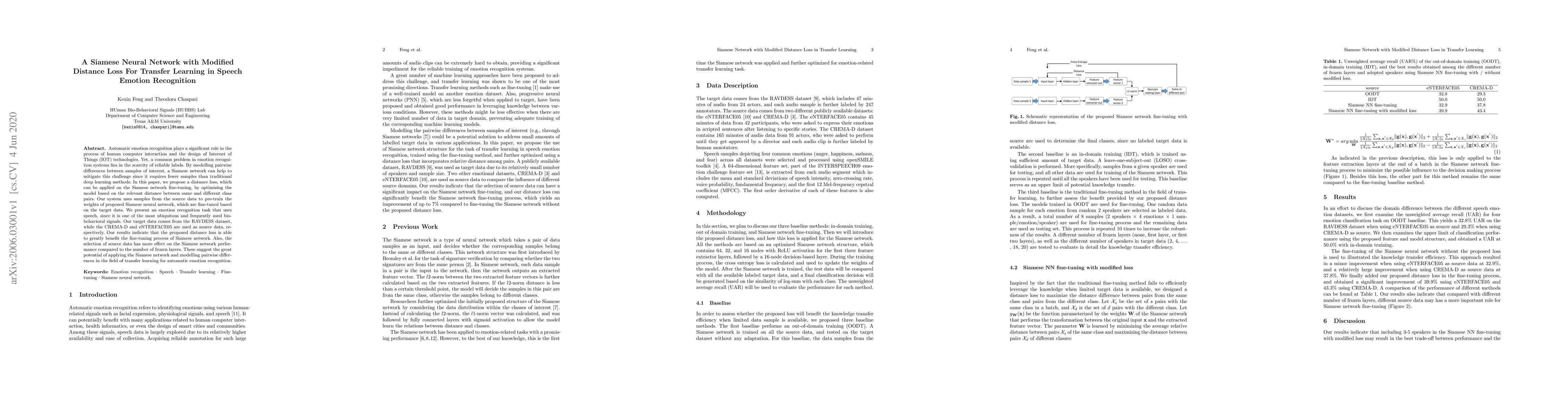 This paper proposes a Siamese neural network with a modified distance loss for transfer learning in speech emotion recognition, addressing the scarcity of labeled data. The distance loss optimizes the model based on the differences between same and different class pairs, significantly improving fine-tuning performance.