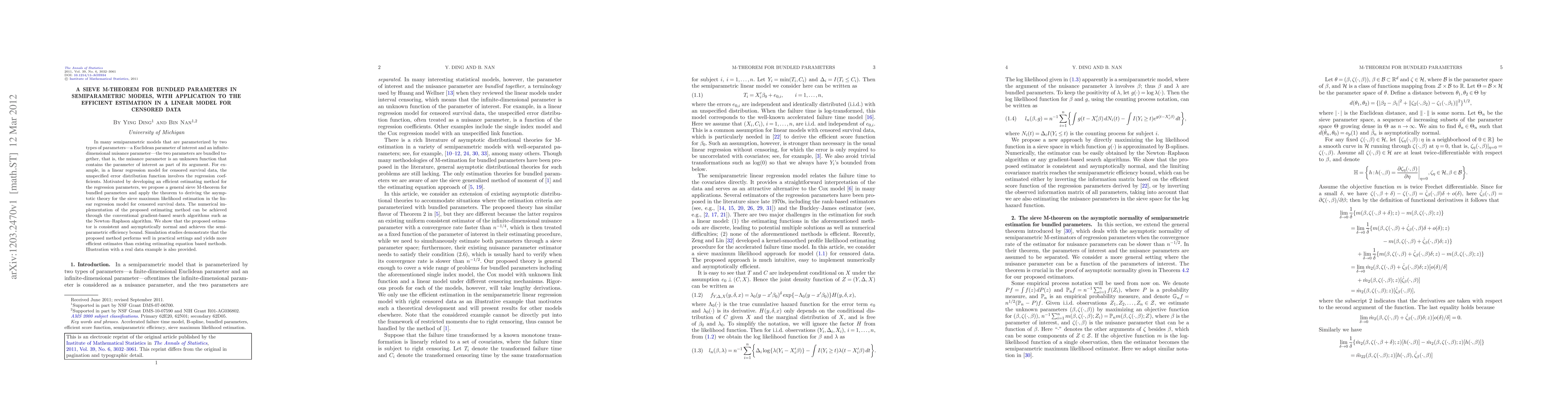 This paper proposes a sieve M-theorem for estimating bundled parameters in semiparametric models, specifically applied to linear regression for censored survival data. The proposed method achieves semiparametric efficiency and outperforms existing methods, as demonstrated through simulations and a real data example.