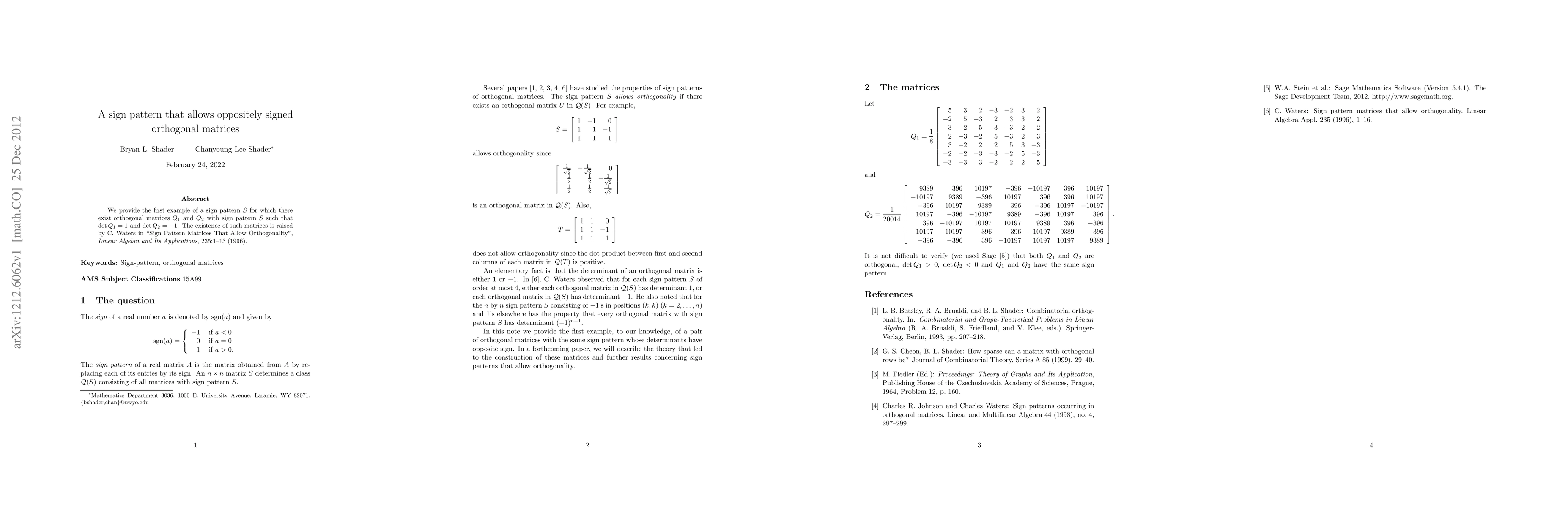 This research presents the first sign pattern S, where orthogonal matrices Q1 and Q2 with sign pattern S exist, having determinants 1 and -1 respectively. It addresses a question posed by C. Waters in 1996 regarding sign patterns allowing orthogonality.