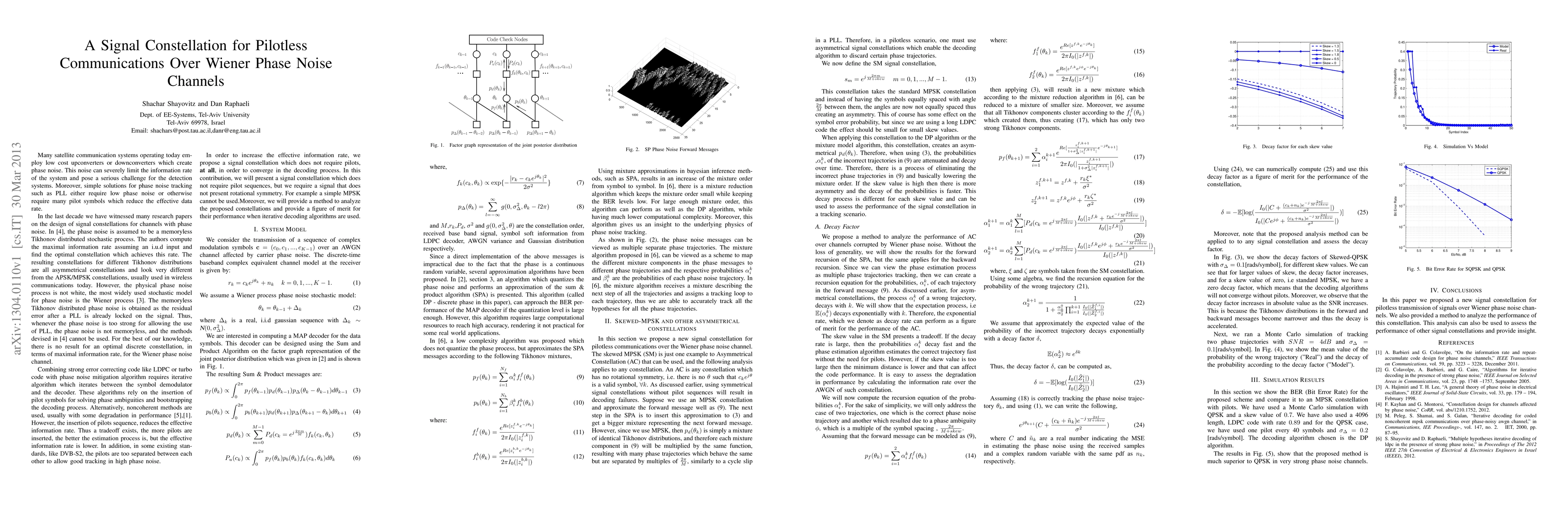 Many satellite communication systems operating today employ low cost upconverters or downconverters which create phase noise. This noise can severely limit the information rate of the system and pose a serious challenge for the detection systems. Moreover, simple solutions for phase noise tracking such as PLL either require low phase noise or otherwise require many pilot symbols which reduce the effective data rate. In order to increase the effective information rate, we propose a signal constellation which does not require pilots, at all, in order to converge in the decoding process. In this contribution, we will present a signal constellation which does not require pilot sequences, but we require a signal that does not present rotational symmetry. For example a simple MPSK cannot be used.Moreover, we will provide a method to analyze the proposed constellations and provide a figure of merit for their performance when iterative decoding algorithms are used.