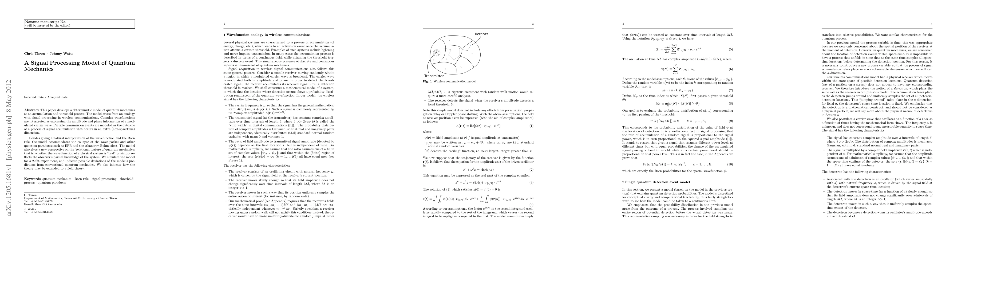 This paper proposes a deterministic signal processing model for quantum mechanics, interpreting complex wavefunctions as modulated carrier waves and particle events as signal accumulation in an extra dimension. The model offers new insights into the wavefunction, wave packet collapse, and quantum paradoxes, and suggests possible deviations from conventional quantum mechanics.