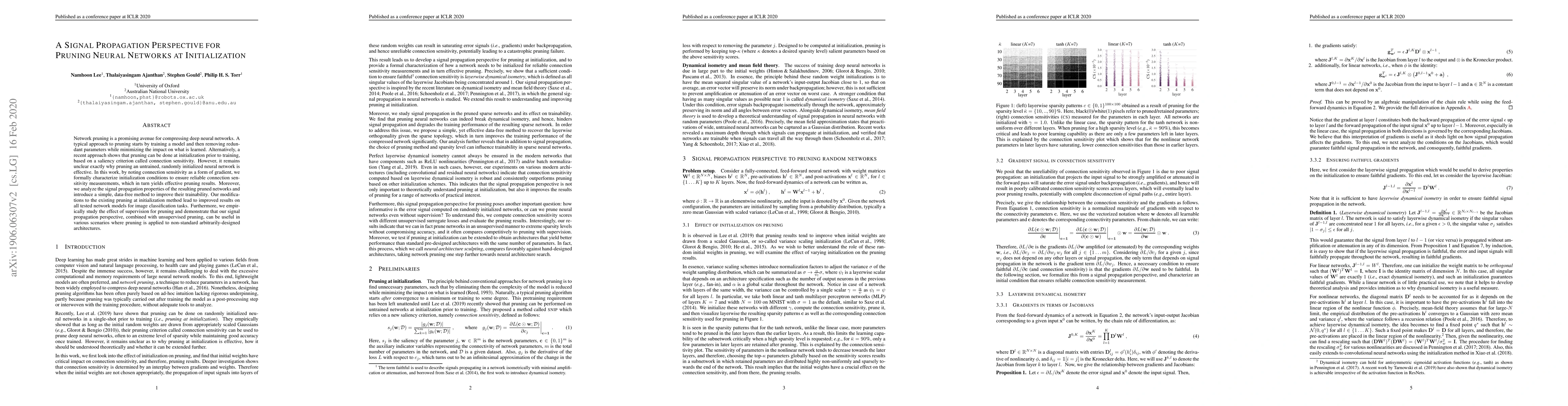 This paper proposes a signal propagation perspective for pruning neural networks at initialization, showing that connection sensitivity can be used as a gradient-like criterion. It introduces methods to improve the trainability of pruned networks and demonstrates improved performance on image classification tasks, highlighting the effectiveness of unsupervised pruning in various network architectures.