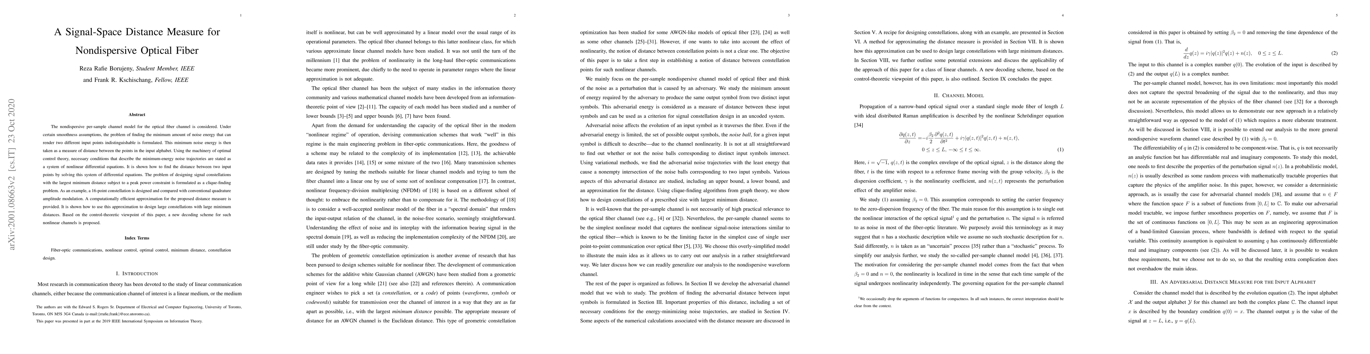 This paper proposes a signal-space distance measure for nondispersive optical fiber channels, formulated using optimal control theory to determine the minimum noise energy for distinguishing input points. It introduces a new decoding scheme and demonstrates the design of large signal constellations with enhanced minimum distances.