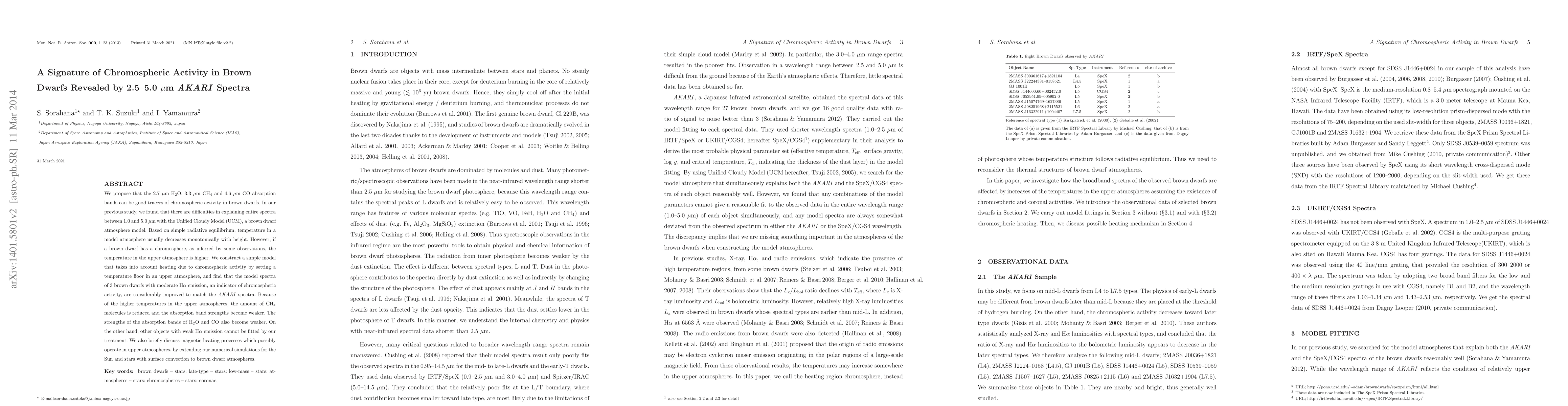 We propose that the 2.7 micron H_2O, 3.3 micron CH_4 and 4.6 micron CO absorption bands can be good tracers of chromospheric activity in brown dwarfs. In our previous study, we found that there are difficulties in explaining entire spectra between 1.0 and 5.0 microns with the Unified Cloudy Model (UCM), a brown dwarf atmosphere model. Based on simple radiative equilibrium, temperature in a model atmosphere usually decreases monotonically with height. However, if a brown dwarf has a chromosphere, as inferred by some observations, the temperature in the upper atmosphere is higher. We construct a simple model that takes into account heating due to chromospheric activity by setting a temperature floor in an upper atmosphere, and find that the model spectra of 3 brown dwarfs with moderate H-alpha emission, an indicator of chromospheric activity, are considerably improved to match the AKARI spectra. Because of the higher temperatures in the upper atmospheres, the amount of CH_4 molecules is reduced and the absorption band strengths become weaker. The strengths of the absorption bands of H_2O and CO also become weaker. On the other hand, other objects with weak H-alpha emission cannot be fitted by our treatment. We also briefly discuss magnetic heating processes which possibly operate in upper atmospheres, by extending our numerical simulations for the Sun and stars with surface convection to brown dwarf atmospheres.