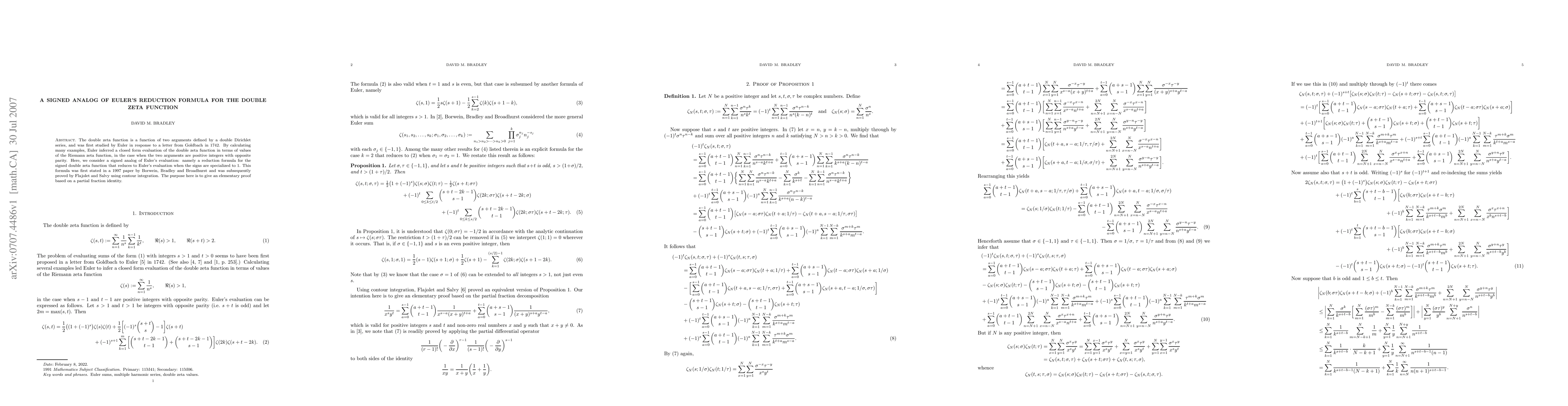 The double zeta function is a function of two arguments defined by a double Dirichlet series, and was first studied by Euler in response to a letter from Goldbach in 1742. By calculating many examples, Euler inferred a closed form evaluation of the double zeta function in terms of values of the Riemann zeta function, in the case when the two arguments are positive integers with opposite parity. Here, we consider a signed analog of Euler's evaluation: namely a reduction formula for the signed double zeta function that reduces to Euler's evaluation when the signs are specialized to 1. This formula was first stated in a 1997 paper by Borwein, Bradley and Broadhurst and was subsequently proved by Flajolet and Salvy using contour integration. The purpose here is to give an elementary proof based on a partial fraction identity.