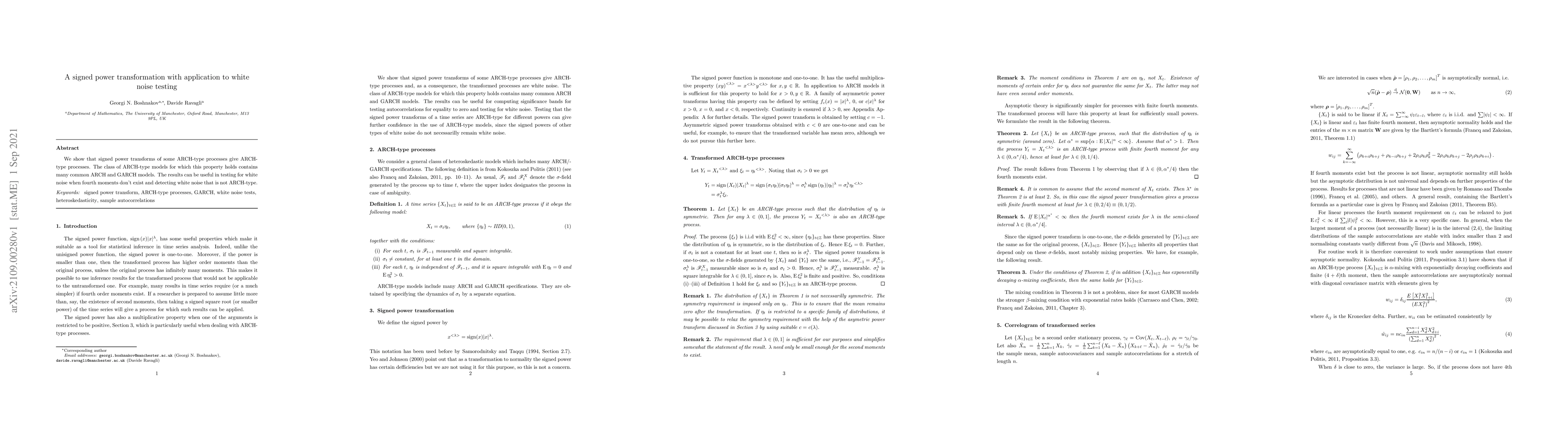 This paper demonstrates that signed power transformations applied to certain ARCH-type processes yield other ARCH-type processes, useful for testing white noise in cases where fourth moments are absent. This method is applicable to many common ARCH and GARCH models.