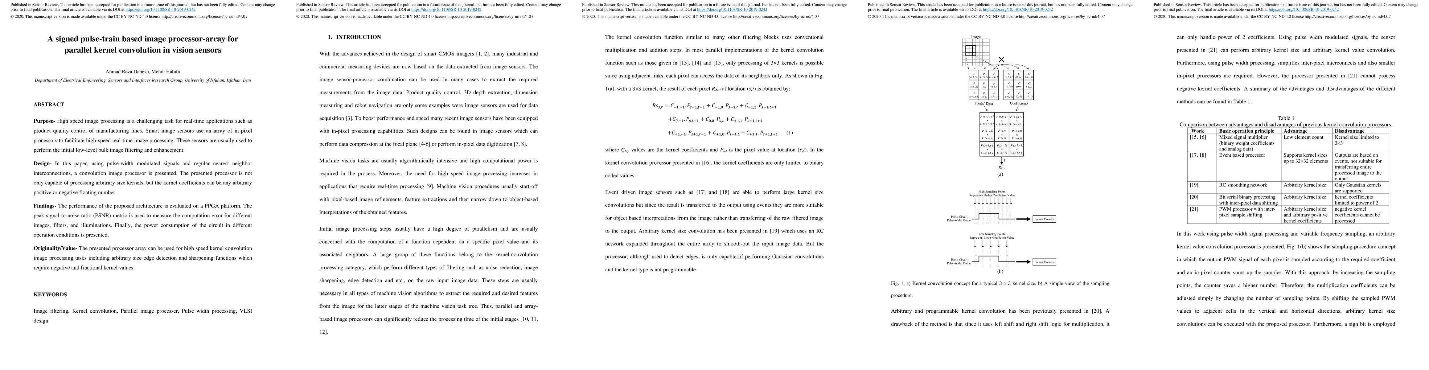Purpose- High speed image processing is a challenging task for real-time applications such as product quality control of manufacturing lines. Smart image sensors use an array of in-pixel processors to facilitate high-speed real-time image processing. These sensors are usually used to perform the initial low-level bulk image filtering and enhancement. Design- In this paper, using pulse-width modulated signals and regular nearest neighbor interconnections, a convolution image processor is presented. The presented processor is not only capable of processing arbitrary size kernels, but the kernel coefficients can be any arbitrary positive or negative floating number. Findings- The performance of the proposed architecture is evaluated on a FPGA platform. The peak signal-to-noise ratio (PSNR) metric is used to measure the computation error for different images, filters, and illuminations. Finally, the power consumption of the circuit in different operation conditions is presented. Originality/Value- The presented processor array can be used for high speed kernel convolution image processing tasks including arbitrary size edge detection and sharpening functions which require negative and fractional kernel values.