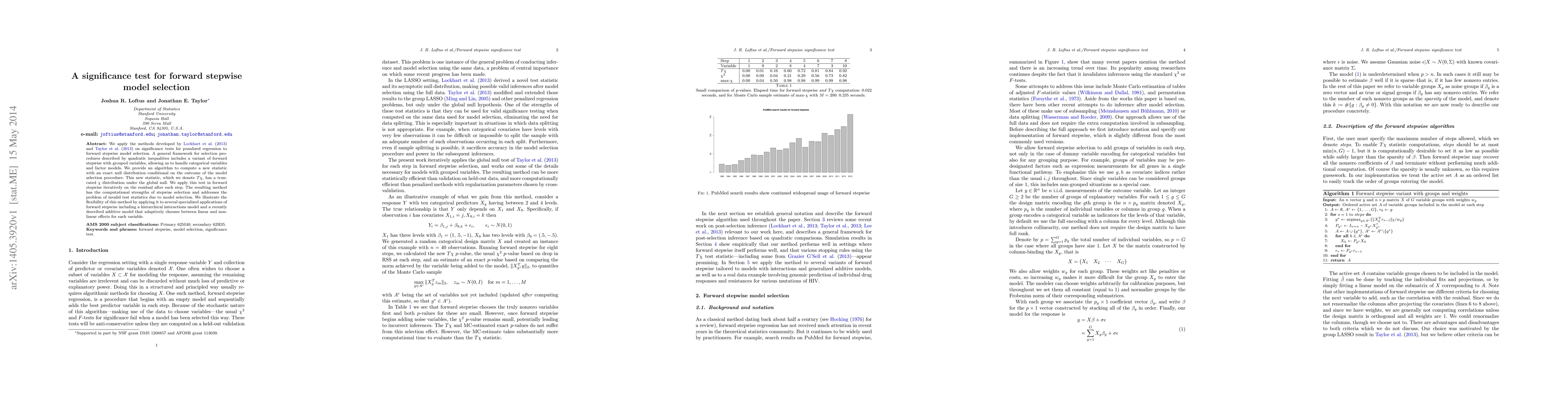 This paper develops a significance test for forward stepwise model selection using methods from penalized regression, providing an algorithm for a new statistic $T\chi$ with a truncated $\chi$ distribution under the global null. The method addresses issues of invalid test statistics due to model selection and is applied to various specialized applications.