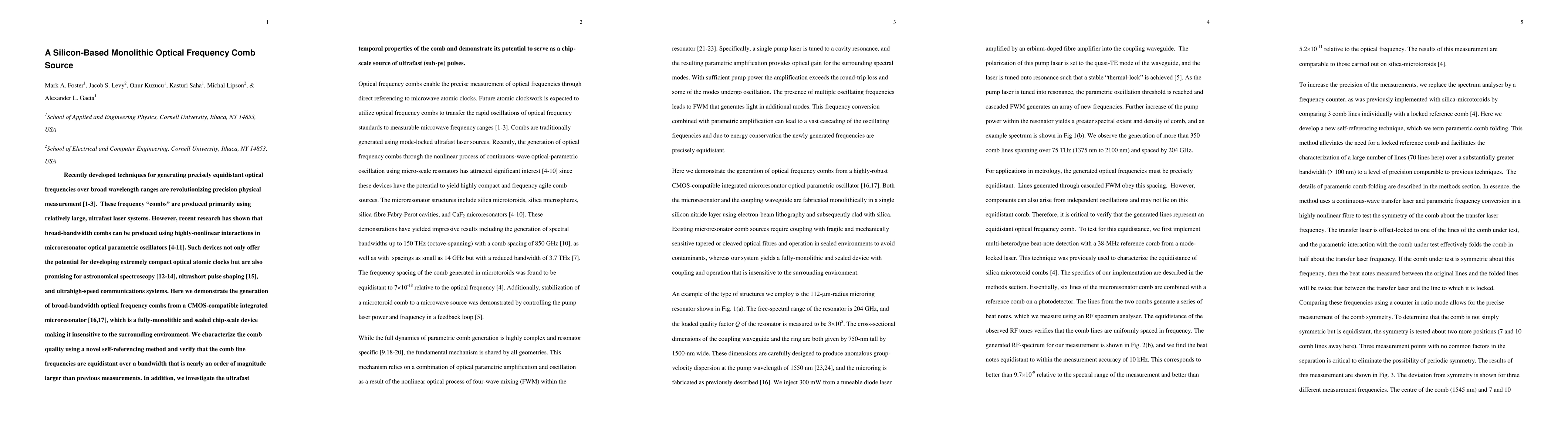 This paper demonstrates the generation of broad-bandwidth optical frequency combs using a CMOS-compatible integrated microresonator, showcasing a compact, fully-monolithic chip-scale device that is insensitive to environmental changes. The comb's high-quality, equidistant frequencies over a large bandwidth and its potential for ultrafast pulse shaping are highlighted.
