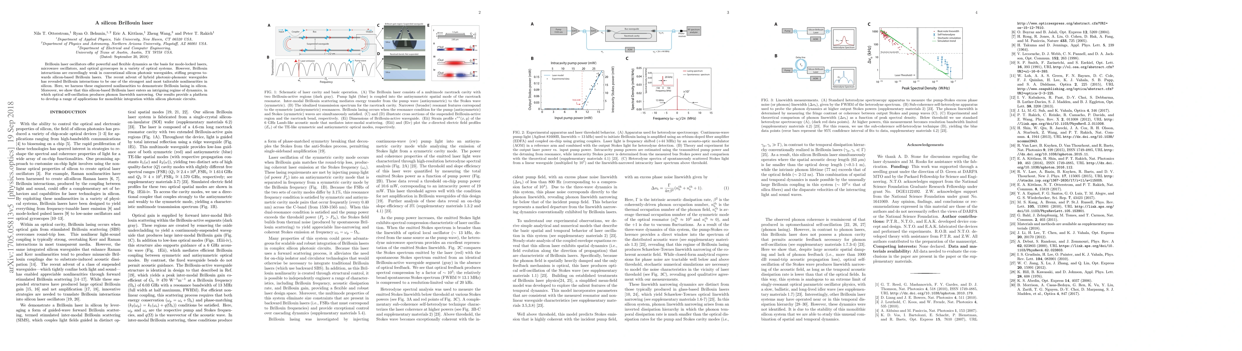 This paper demonstrates the first Brillouin laser oscillator in silicon using hybrid photonic-phononic waveguides, revealing strong and customizable nonlinearities. The study shows optical self-oscillation that narrows phonon linewidth, opening avenues for applications in integrated silicon photonic circuits.