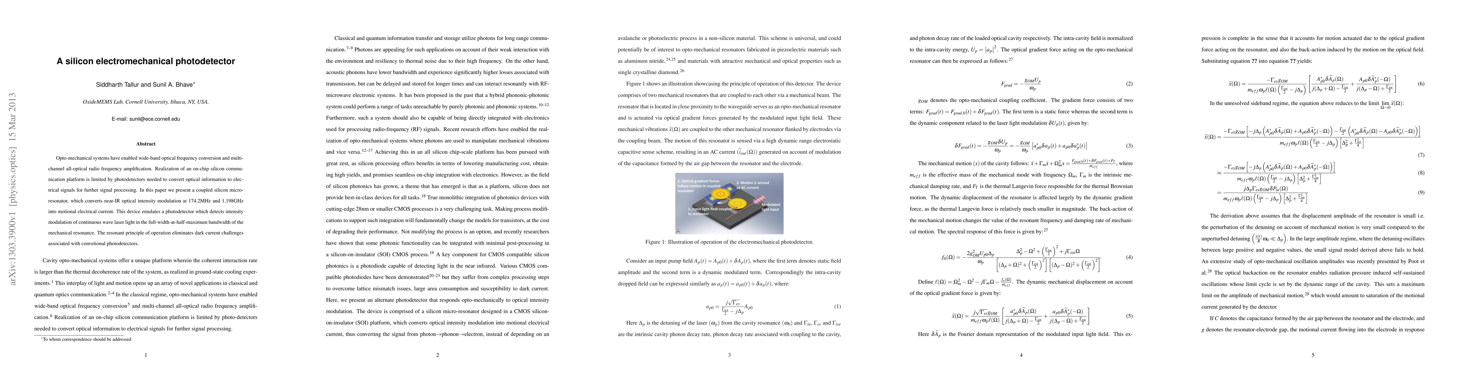 This paper introduces a silicon micro-resonator that converts near-IR optical signals into electrical current, functioning as a photodetector with resonant operation to avoid dark current issues, enhancing on-chip communication platforms. The device operates effectively at optical modulation frequencies of 174.2MHz and 1.198GHz.