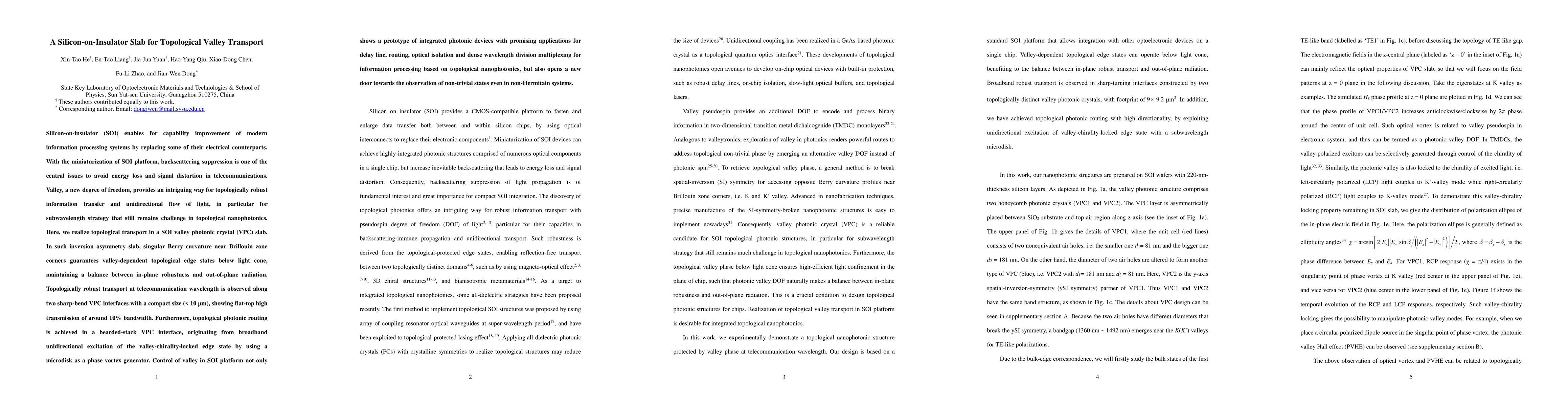 Silicon-on-insulator (SOI) enables for capability improvement of modern information processing systems by replacing some of their electrical counterparts. With the miniaturization of SOI platform, backscattering suppression is one of the central issues to avoid energy loss and signal distortion in telecommunications. Valley, a new degree of freedom, provides an intriguing way for topologically robust information transfer and unidirectional flow of light, in particular for subwavelength strategy that still remains challenge in topological nanophotonics. Here, we realize topological transport in a SOI valley photonic crystal (VPC) slab. In such inversion asymmetry slab, singular Berry curvature near Brillouin zone corners guarantees valley-dependent topological edge states below light cone, maintaining a balance between in-plane robustness and out-of-plane radiation. Topologically robust transport at telecommunication wavelength is observed along two sharp-bend VPC interfaces with a compact size (< 10 um), showing flat-top high transmission of around 10% bandwidth. Furthermore, topological photonic routing is achieved in a bearded-stack VPC interface, originating from broadband unidirectional excitation of the valley-chirality-locked edge state by using a microdisk as a phase vortex generator. Control of valley in SOI platform not only shows a prototype of integrated photonic devices with promising applications for delay line, routing, optical isolation and dense wavelength division multiplexing for information processing based on topological nanophotonics, but also opens a new door towards the observation of non-trivial states even in non-Hermitain systems.