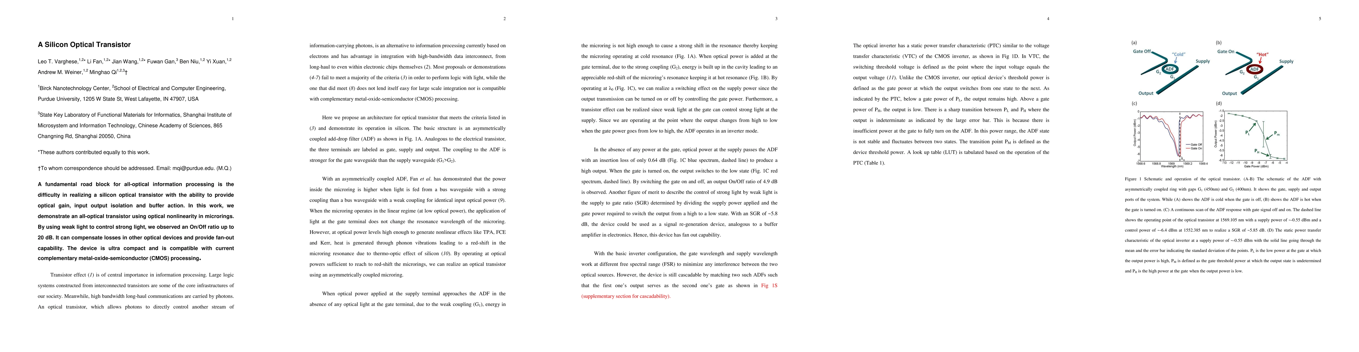 This paper presents an all-optical transistor based on optical nonlinearity in microrings, achieving an On/Off ratio of up to 20 dB, which provides optical gain, input-output isolation, and buffer action, while being ultra-compact and CMOS compatible.