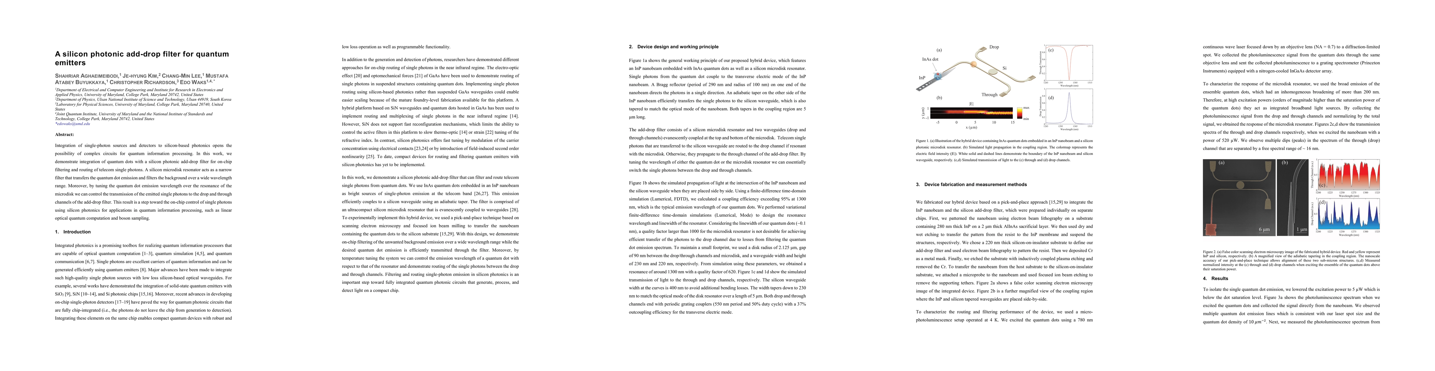 This research demonstrates the integration of quantum dots with a silicon photonic add-drop filter for on-chip filtering and routing of telecom single photons, using a silicon microdisk resonator to control transmission. The work represents a significant step toward on-chip quantum information processing applications.