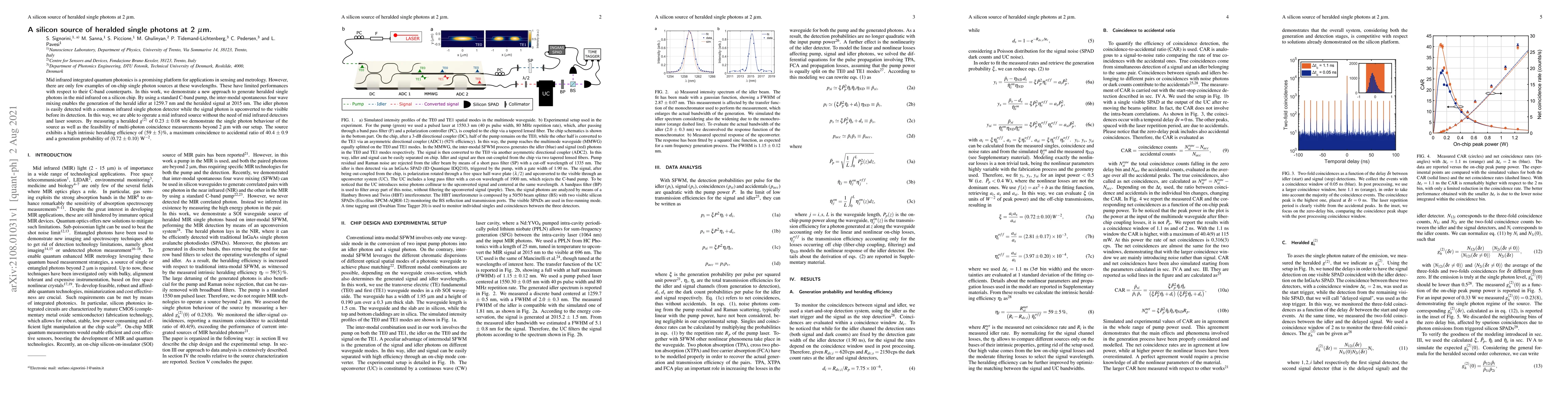 Mid infrared integrated quantum photonics is a promising platform for applications in sensing and metrology. However, there are only few examples of on-chip single photon sources at these wavelengths. These have limited performances with respect to their C-band counterparts. In this work, we demonstrate a new approach to generate heralded single photons in the mid infrared on a silicon chip. By using a standard C-band pump, the inter-modal spontaneous four wave mixing enables the generation of the herald idler at 1259.7 nm and the heralded signal at 2015 nm. The idler photon is easily detected with a common infrared single photon detector while the signal photon is upconverted to the visible before its detection. In this way, we are able to operate a mid infrared source without the need of mid infrared detectors and laser sources. By measuring a heralded $g^{(2)}$ of $0.23 \, \pm \, 0.08$ we demonstrate the single photon behaviour of the source as well as the feasibility of multi-photon coincidence measurements beyond 2 $\mu$m with our setup. The source exhibits a high intrinsic heralding efficiency of $(59 \, \pm \,5)\%$, a maximum coincidence to accidental ratio of $40.4 \, \pm \, 0.9$ and a generation probability of $\left( 0.72 \, \pm \, 0.10 \right)$ W$^{-2}$.