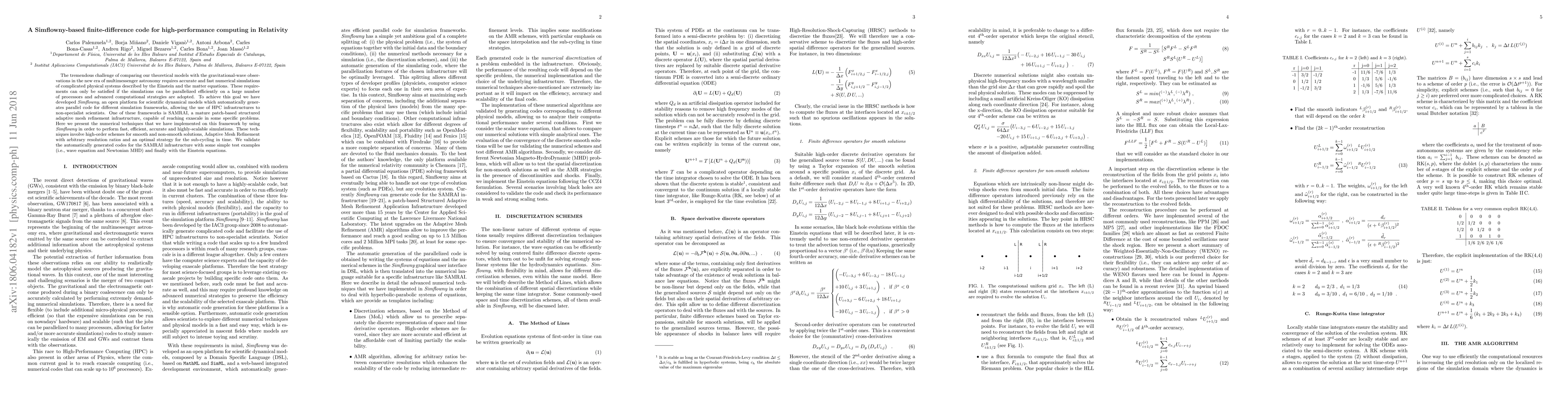 The tremendous challenge of comparing our theoretical models with the gravitational-wave observations in the new era of multimessenger astronomy requires accurate and fast numerical simulations of complicated physical systems described by the Einstein and the matter equations. These requirements can only be satisfied if the simulations can be parallelized efficiently on a large number of processors and advanced computational strategies are adopted. To achieve this goal we have developed Simflowny, an open platform for scientific dynamical models which automatically generates parallel code for different simulation frameworks, allowing the use of HPC infrastructures to non-specialist scientists. One of these frameworks is SAMRAI, a mature patch-based structured adaptive mesh refinement infrastructure, capable of reaching exascale in some specific problems. Here we present the numerical techniques that we have implemented on this framework by using Simflowny in order to perform fast, efficient, accurate and highly-scalable simulations. These techniques involve high-order schemes for smooth and non-smooth solutions, Adaptive Mesh Refinement with arbitrary resolution ratios and an optimal strategy for the sub-cycling in time. We validate the automatically generated codes for the SAMRAI infrastructure with some simple test examples (i.e., wave equation and Newtonian MHD) and finally with the Einstein equations.
