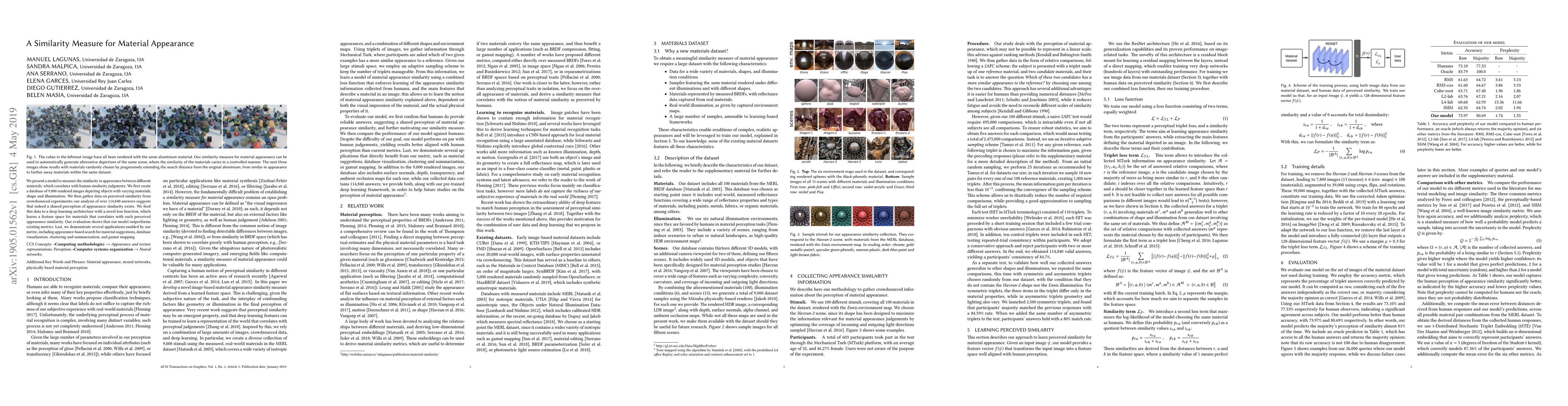 This paper introduces a deep learning model to measure material appearance similarity, correlating with human judgments. It leverages a database of 9,000 rendered images and crowdsourced data to train the model, which outperforms existing metrics and enables applications like material search and database visualization.