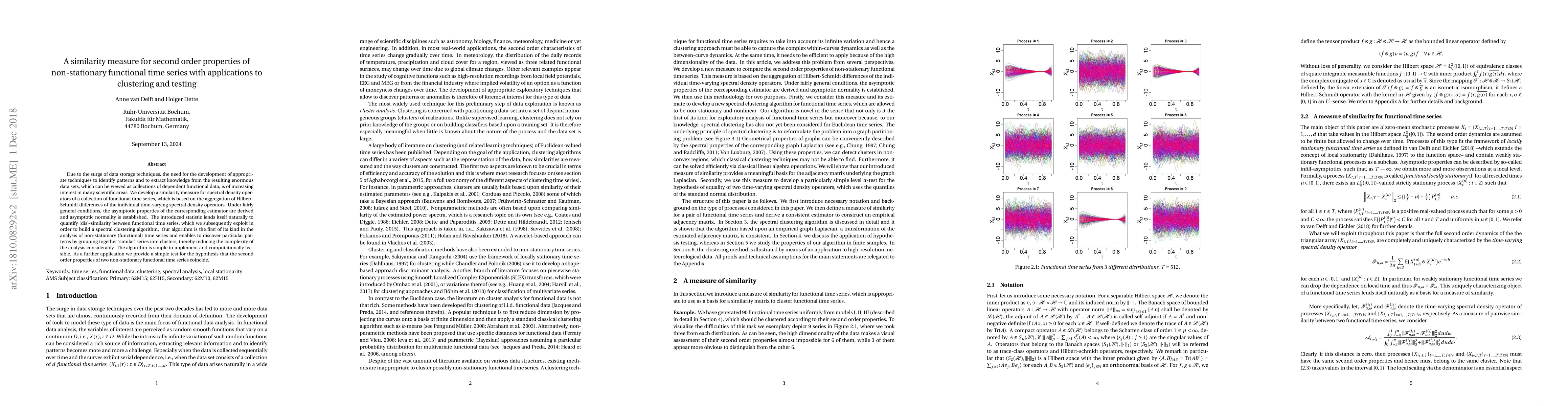 Due to the surge of data storage techniques, the need for the development of appropriate techniques to identify patterns and to extract knowledge from the resulting enormous data sets, which can be viewed as collections of dependent functional data, is of increasing interest in many scientific areas. We develop a similarity measure for spectral density operators of a collection of functional time series, which is based on the aggregation of Hilbert-Schmidt differences of the individual time-varying spectral density operators. Under fairly general conditions, the asymptotic properties of the corresponding estimator are derived and asymptotic normality is established. The introduced statistic lends itself naturally to quantify (dis)-similarity between functional time series, which we subsequently exploit in order to build a spectral clustering algorithm. Our algorithm is the first of its kind in the analysis of non-stationary (functional) time series and enables to discover particular patterns by grouping together `similar' series into clusters, thereby reducing the complexity of the analysis considerably. The algorithm is simple to implement and computationally feasible. As a further application we provide a simple test for the hypothesis that the second order properties of two non-stationary functional time series coincide.