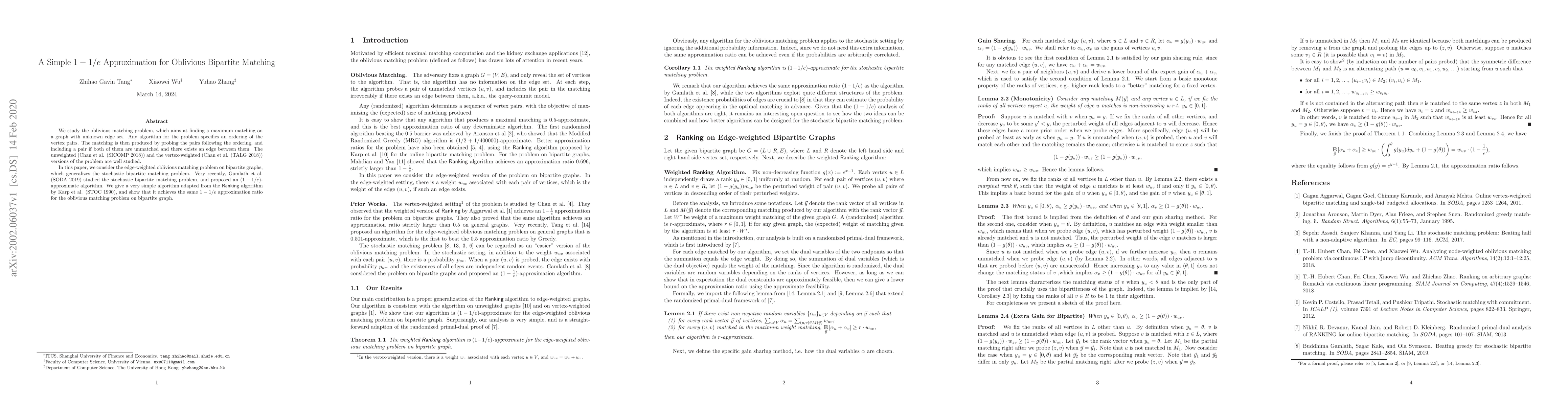 Researchers developed a simple algorithm for oblivious bipartite matching on edge-weighted graphs, achieving a 1-1/e approximation ratio similar to a previously studied stochastic bipartite matching problem.