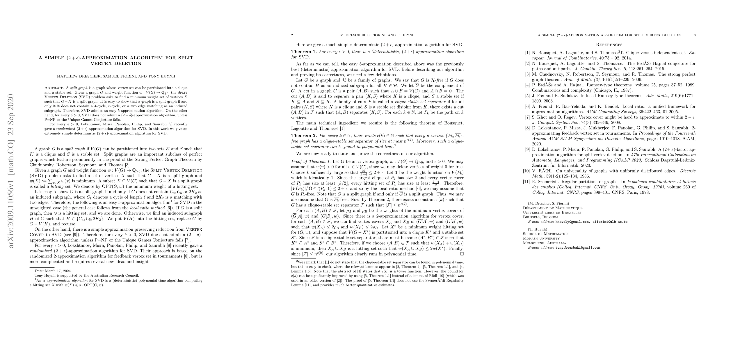 A split graph is a graph whose vertex set can be partitioned into a clique and a stable set. Given a graph $G$ and weight function $w: V(G) \to \mathbb{Q}_{\geq 0}$, the Split Vertex Deletion (SVD) problem asks to find a minimum weight set of vertices $X$ such that $G-X$ is a split graph. It is easy to show that a graph is a split graph if and only it it does not contain a $4$-cycle, $5$-cycle, or a two edge matching as an induced subgraph. Therefore, SVD admits an easy $5$-approximation algorithm. On the other hand, for every $\delta >0$, SVD does not admit a $(2-\delta)$-approximation algorithm, unless P=NP or the Unique Games Conjecture fails. For every $\epsilon >0$, Lokshtanov, Misra, Panolan, Philip, and Saurabh recently gave a randomized $(2+\epsilon)$-approximation algorithm for SVD. In this work we give an extremely simple deterministic $(2+\epsilon)$-approximation algorithm for SVD.