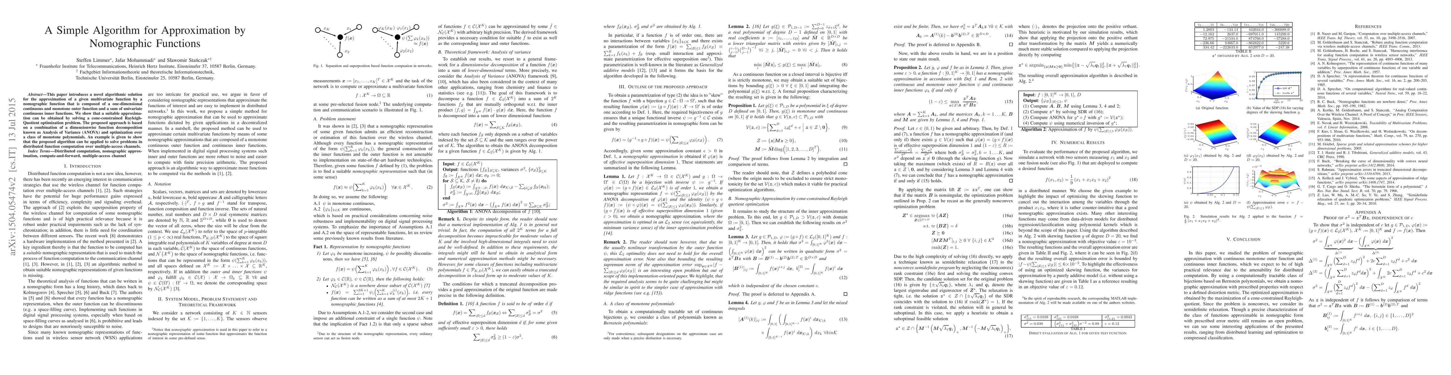 This paper introduces a novel algorithm for approximating multivariate functions using nomographic functions, which can be optimized through a cone-constrained Rayleigh-Quotient optimization problem.