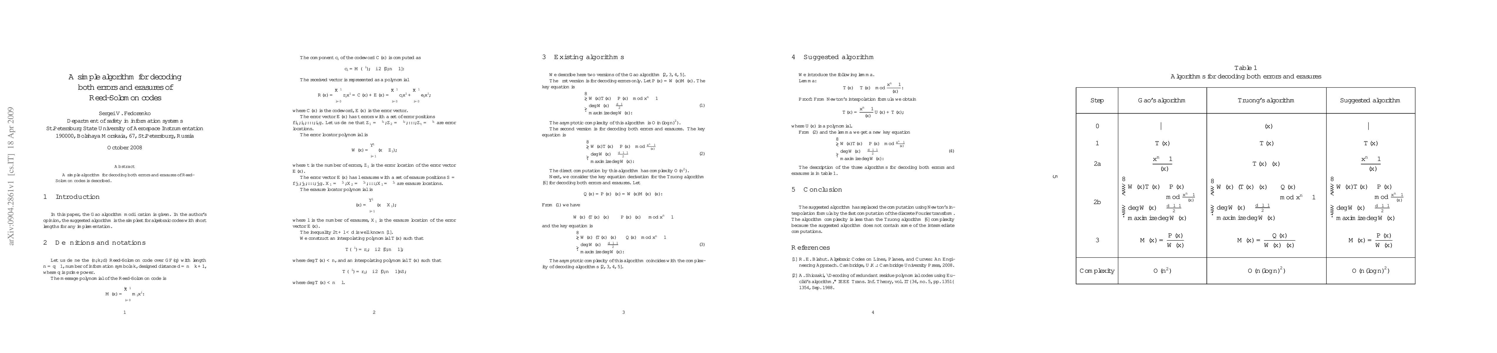 Summary: This paper presents a straightforward algorithm for decoding Reed-Solomon codes that can effectively handle both errors and erasures, enhancing the robustness of error correction in communication systems. The method simplifies the decoding process while maintaining high accuracy.
