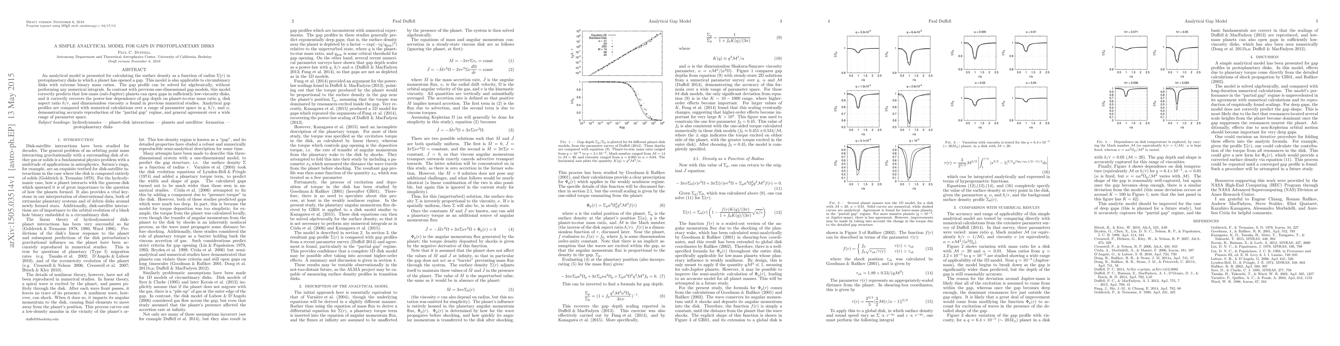 An analytical model calculates gap profiles in protoplanetary disks with a planet opening a gap, accurately predicting low-mass planet behavior and the power-law dependence of gap depth on key parameters.
