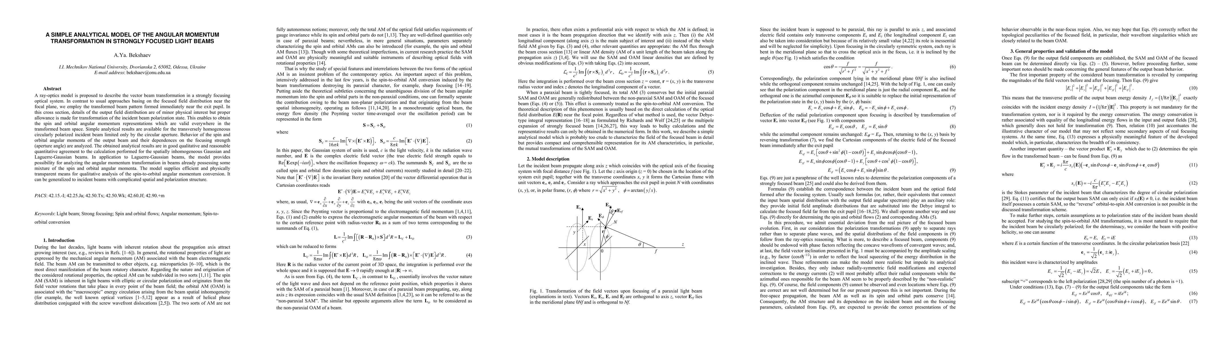 This paper proposes a ray-optics model to describe the angular momentum transformation in strongly focused light beams, focusing on the exit pupil's transformed beam pattern. The model provides analytical results for spin and orbital angular momentum representations, showing good agreement with calculations for Gaussian and Laguerre-Gaussian beams.