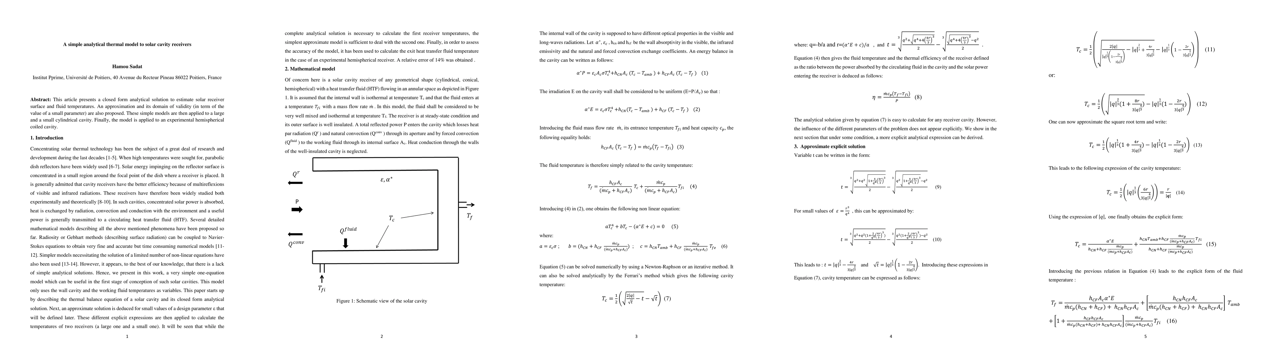 This paper develops a simple analytical model to estimate temperatures in solar cavity receivers, validated through applications to different cavity shapes including experimental setups. The model provides quick, accurate predictions useful for designing and optimizing solar thermal systems.