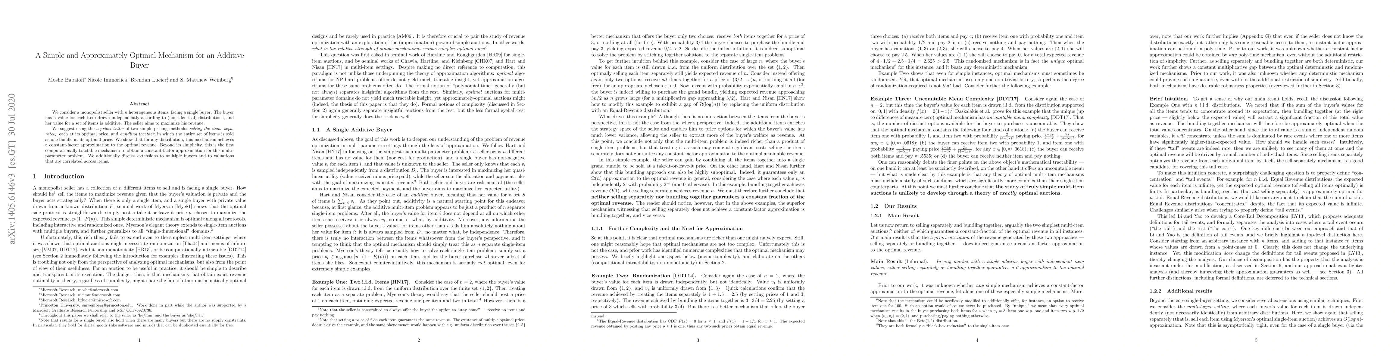This paper proposes a simple mechanism for a monopolist seller with multiple items to maximize revenue from an additive value buyer. The mechanism, a-priori better of separate and bundle pricing, achieves a constant-factor approximation of optimal revenue for any distribution, and is computationally efficient. The authors also discuss extensions to multiple buyers and correlated item valuations.