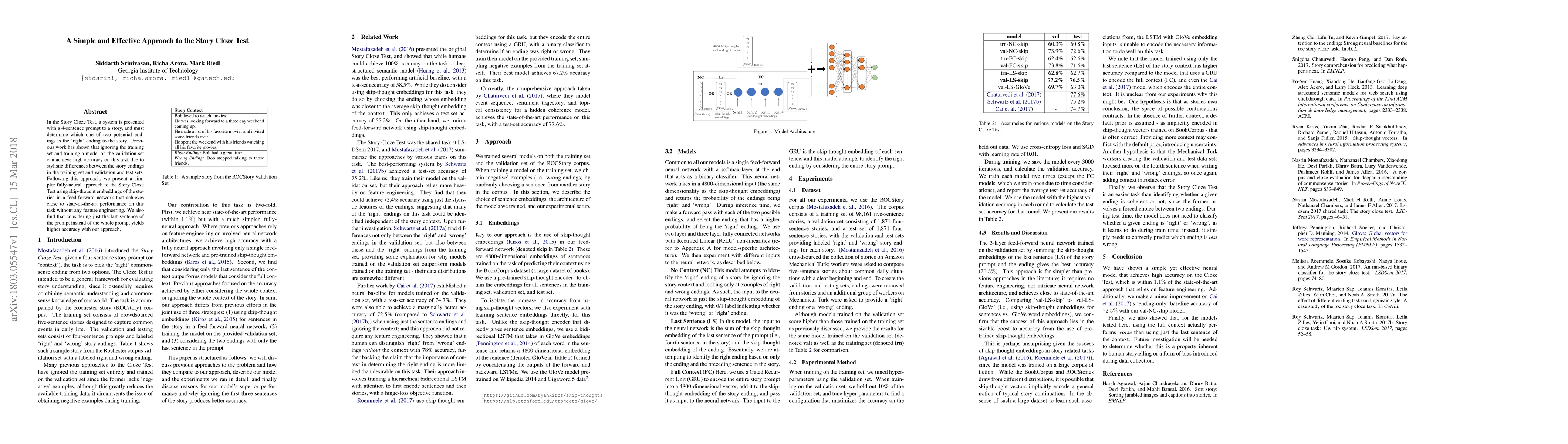 This paper proposes a simple neural network using skip-thought embeddings to achieve near state-of-the-art performance on the Story Cloze Test, demonstrating that training on the validation set can yield high accuracy. It also finds that focusing solely on the last sentence of the prompt improves results.