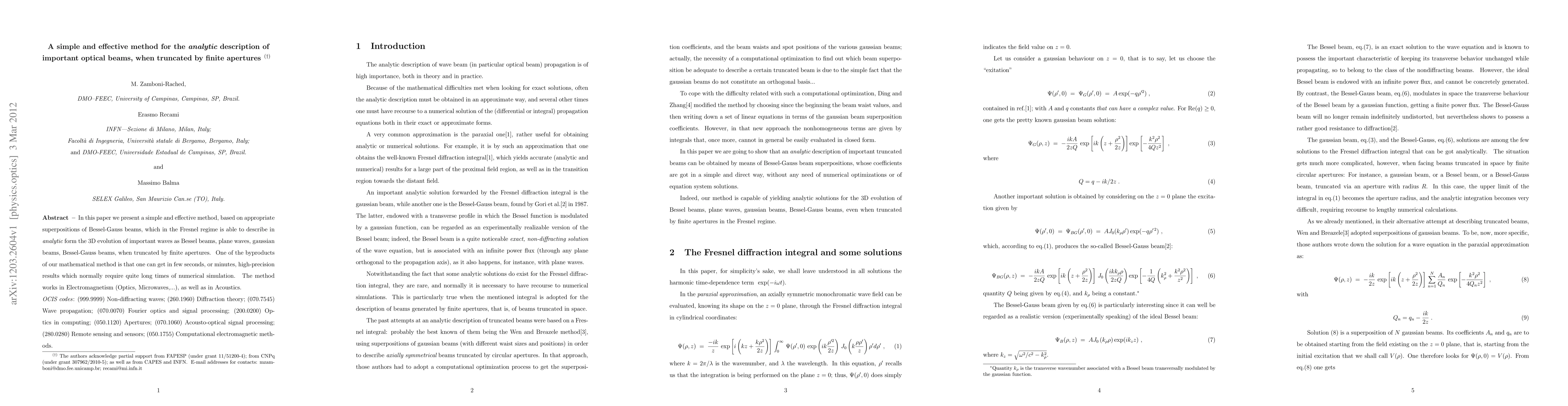 This paper introduces a straightforward method for analytically describing the 3D evolution of various optical beams, including Bessel, plane, and Gaussian beams, when they are truncated by finite apertures. The method leverages superpositions of Bessel-Gauss beams and provides high-precision results quickly, applicable across Electromagnetism and Acoustics.