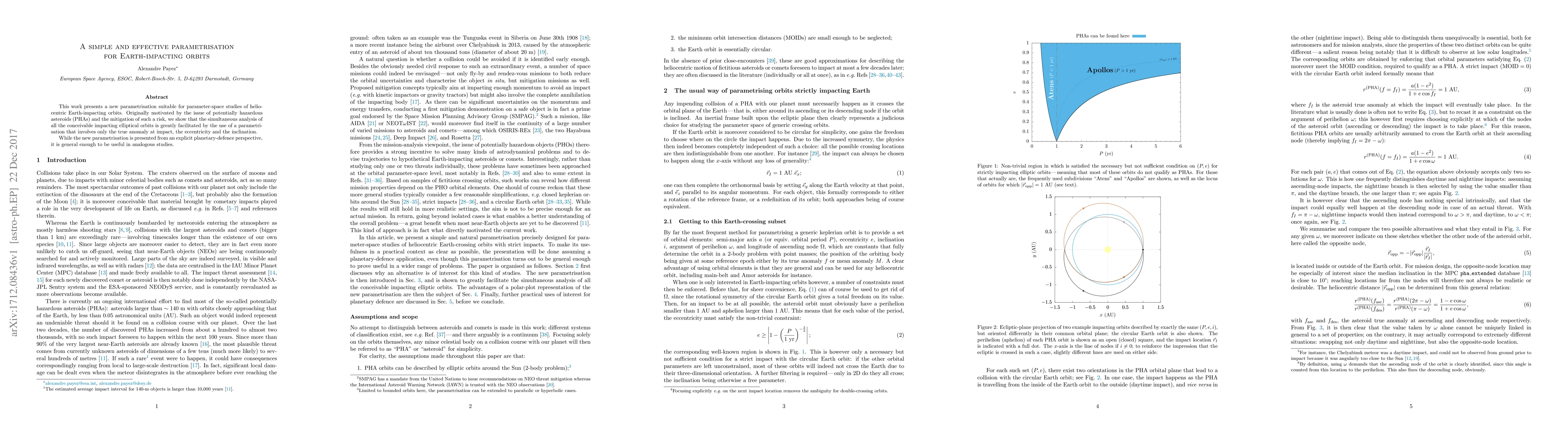 This work presents a new parametrisation suitable for parameter-space studies of heliocentric Earth-impacting orbits. Originally motivated by the issue of potentially hazardous asteroids (PHAs) and the mitigation of such a risk, we show that the simultaneous analysis of all the conceivable impacting elliptical orbits is greatly facilitated by the use of a parametrisation that involves only the true anomaly at impact, the eccentricity and the inclination. While the new parametrisation is presented from an explicit planetary-defence perspective, it is general enough to be useful in analogous studies.