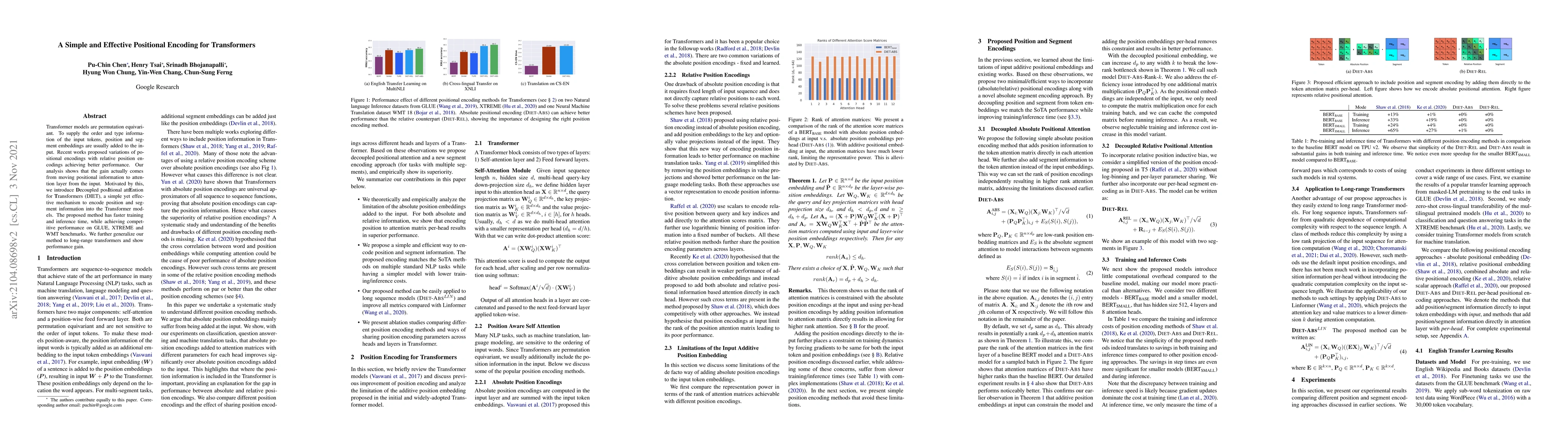 This paper introduces Decoupled Positional Attention for Transformers (DIET), a method to encode positional and segment information into Transformer models, achieving faster training and inference times while maintaining competitive performance on various benchmarks. The approach decouples positional information from input embeddings, enhancing efficiency and effectiveness.
