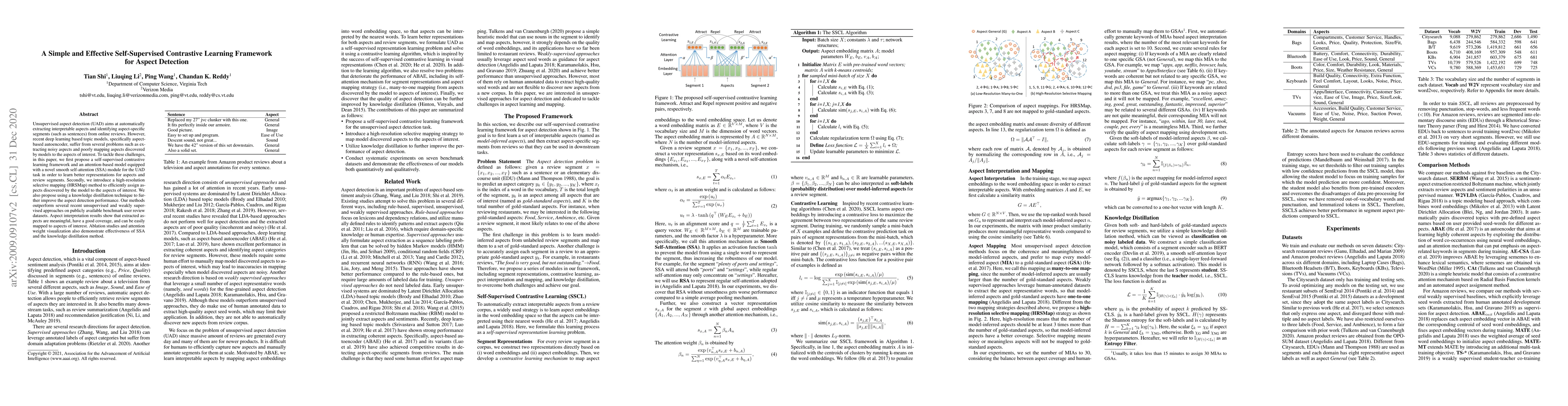 This paper introduces a self-supervised contrastive learning framework and an attention-based model with a novel smooth self-attention (SSA) module for unsupervised aspect detection in online reviews. It also proposes a high-resolution selective mapping (HRSMap) method for efficient aspect assignment and a knowledge distilling technique for performance improvement. The methods surpass recent unsupervised and weakly supervised approaches on benchmark datasets, with meaningful, comprehensive, and easily interpretable aspects.