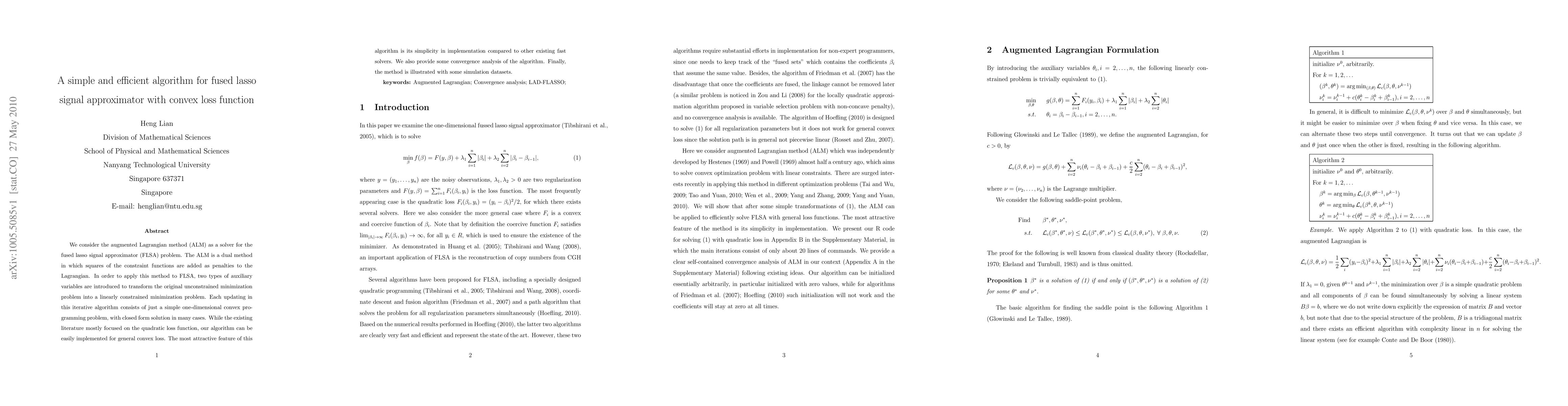 This paper proposes an augmented Lagrangian method (ALM) for solving the fused lasso signal approximator (FLSA) problem with general convex loss functions, featuring simple iterative updates and closed-form solutions. The algorithm is shown to be more straightforward to implement compared to existing fast solvers, with a convergence analysis and demonstration on simulation datasets.
