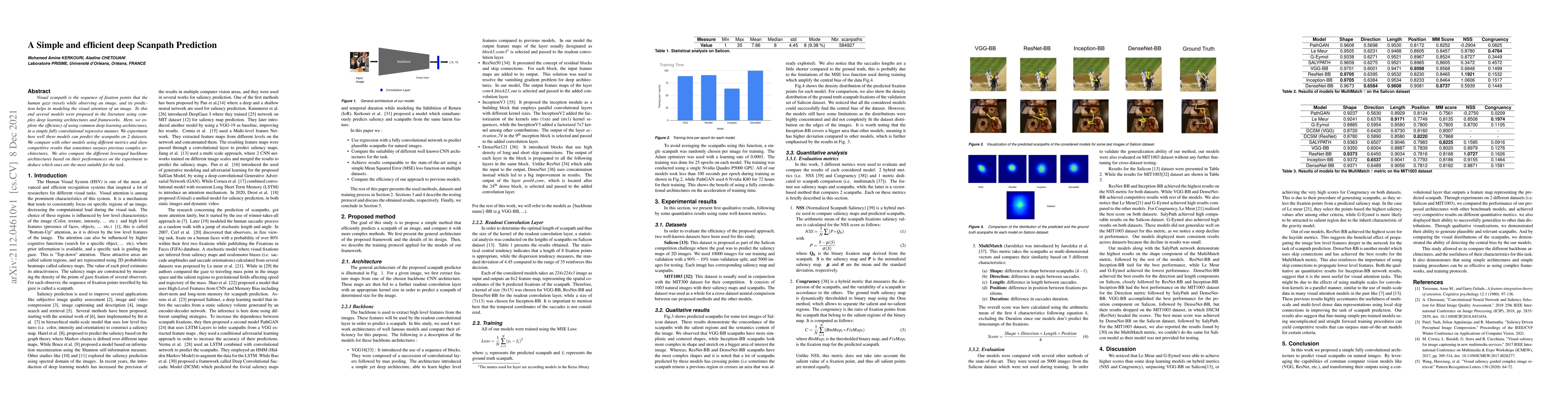 The paper proposes a simple fully convolutional architecture for predicting visual scanpaths on natural images by leveraging common deep learning architectures in a regressive manner. It compares the efficiency of different backbone architectures (VGG16, ResNet50, InceptionV3, DenseNet121) for the task using Mean Squared Error (MSE) loss function on two datasets: Salicon and MIT1003.