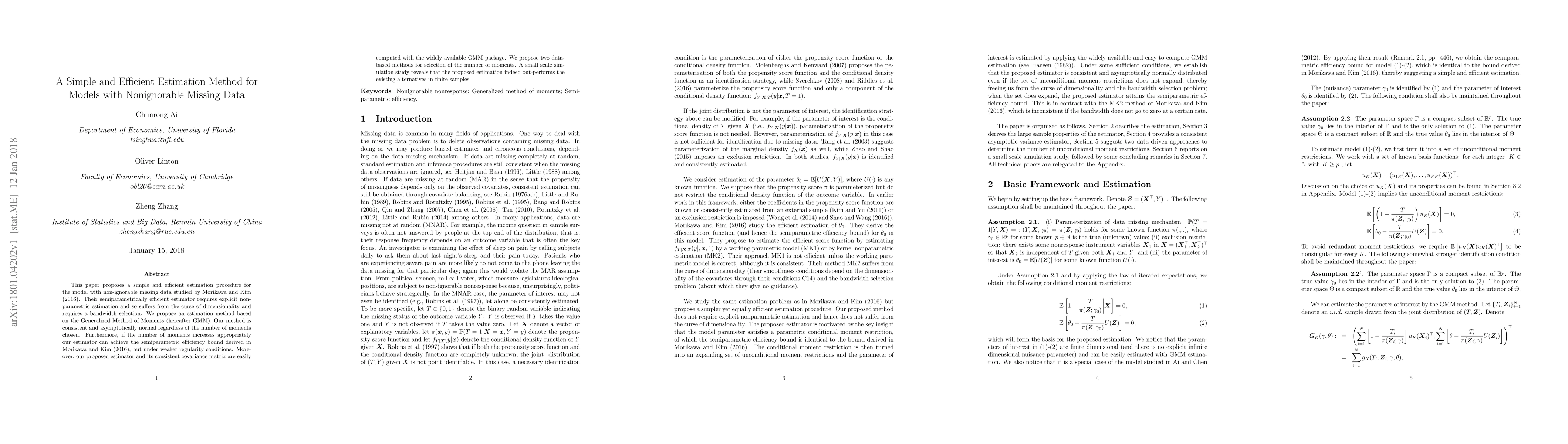 A new method based on Generalized Method of Moments (GMM) is proposed for efficiently estimating models with non-ignorable missing data, offering consistency, asymptotic normality, and potentially achieving semiparametric efficiency under weaker conditions.