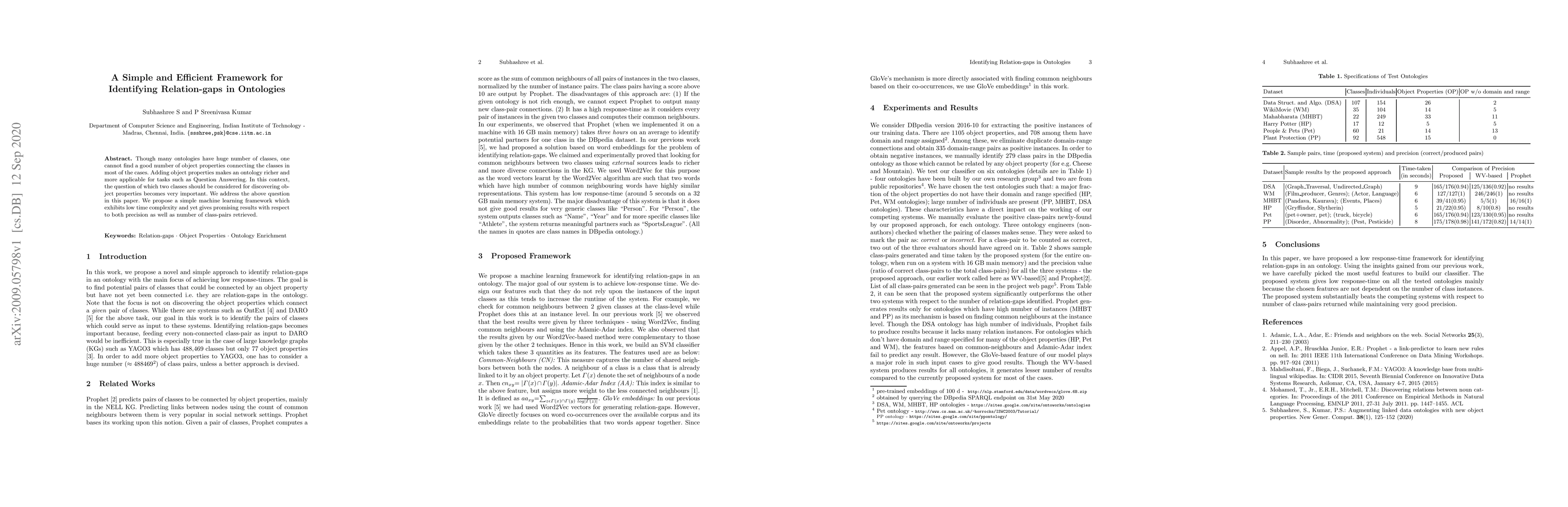 The paper proposes a machine learning framework that identifies relation-gaps in ontologies with low time complexity, focusing on finding potential class-pairs that could be connected by an object property without being currently connected.