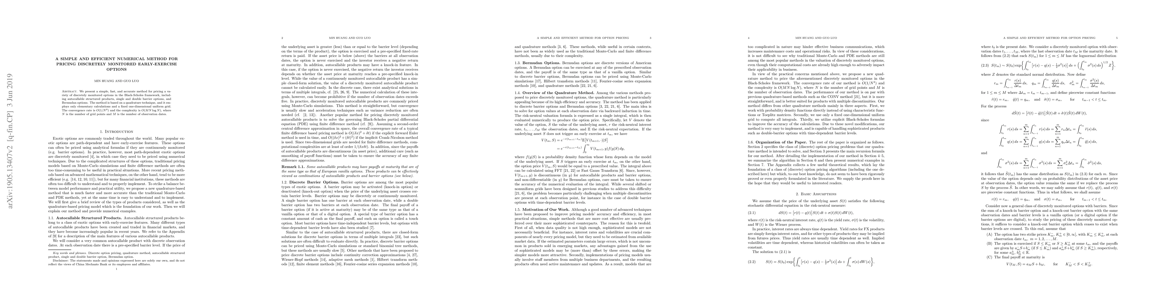 We present a simple, fast, and accurate method for pricing a variety of discretely monitored options in the Black-Scholes framework, including autocallable structured products, single and double barrier options, and Bermudan options. The method is based on a quadrature technique, and it employs only elementary calculations and a fixed one-dimensional uniform grid. The convergence rate is $O(1/N^4)$ and the complexity is $O(MN\log N)$, where $N$ is the number of grid points and $M$ is the number of observation dates.